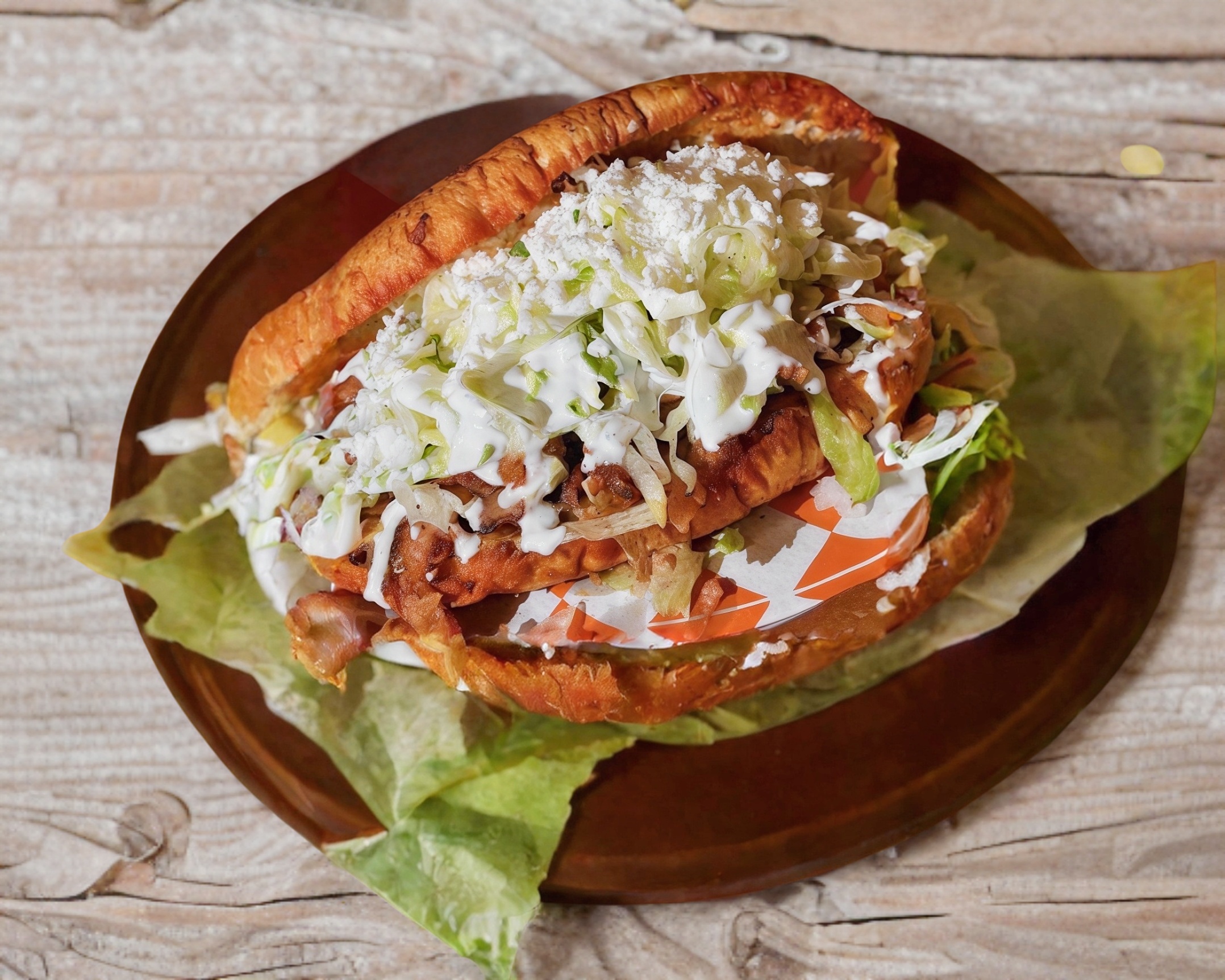 Pan suave bañado en salsa de chile guajillo, relleno de papas y chorizo, acompañado de lechuga, crema, queso rallado y cebolla.