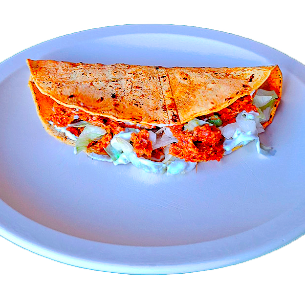 Quesadilla de tinga, hecha con tortilla de maíz (20 cms), y queso gratinado.