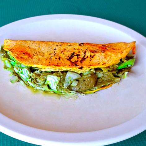 Quesadilla de chicharrón en salsa verde, hecha con tortilla de maíz (20 cms), y queso gratinado.