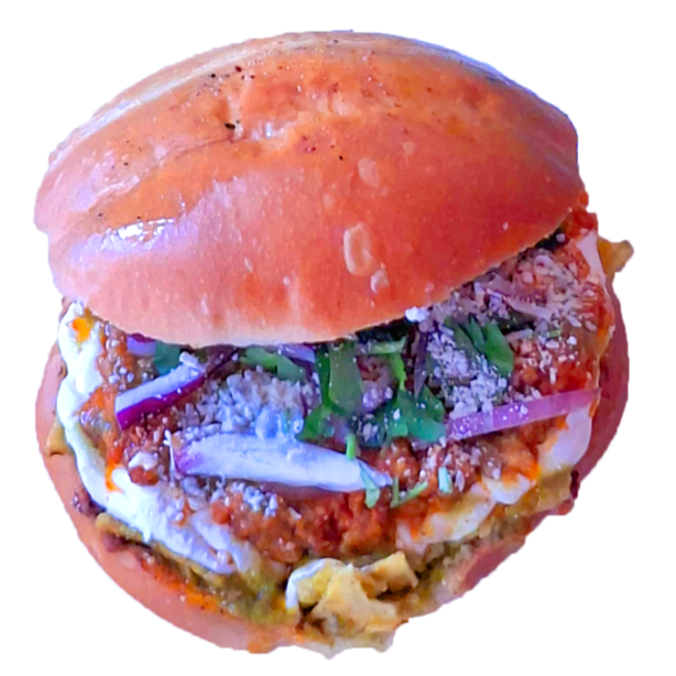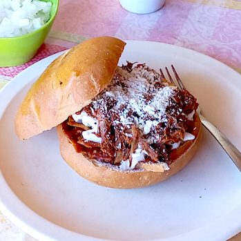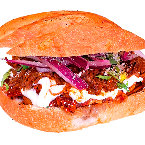 Torta de carne de res deshebrada bañada en deliciosa salsa de birria, hecha con bolillo y acompañada de cebolla, cilantro y limón.