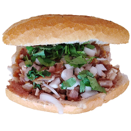Torta de carne asada de puerco a la plancha bien picadita, hecha con bolillo, frijoles refritos, mayonesa, cebolla y limón.