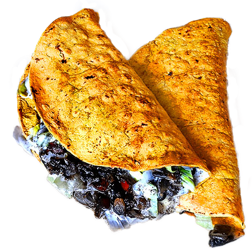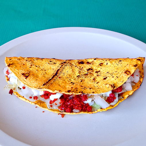 Taco de carne asada de puerco a la plancha bien picadita, hecho con tortilla de maíz blanco, untada con frijoles refritos negros, acompañado con cebolla y limón.