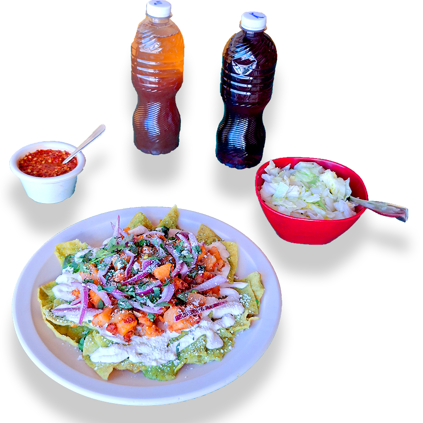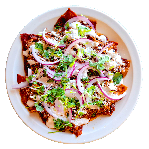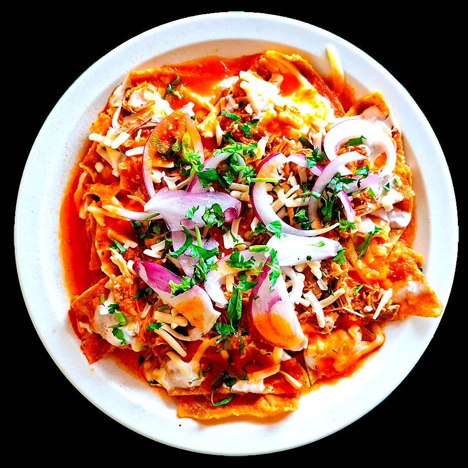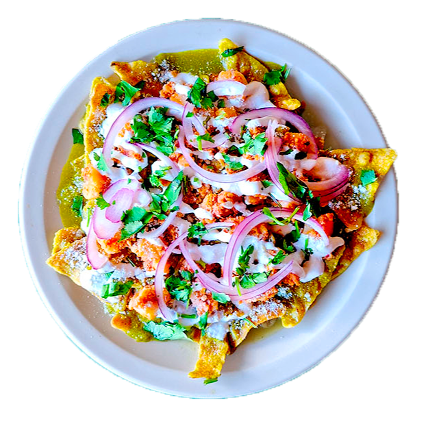 Torta con totopos bañados en salsa roja o verde, guiso a su elección, frijoles, crema, cebolla y queso.