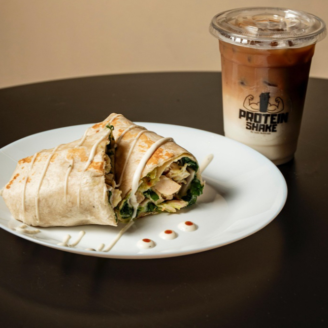 Delicioso wrap de pollo acompañado de un delicioso latte