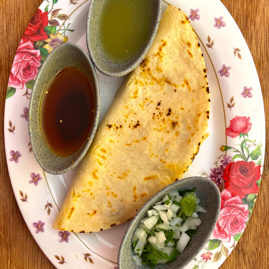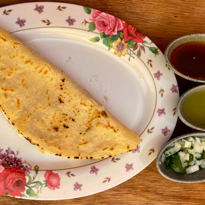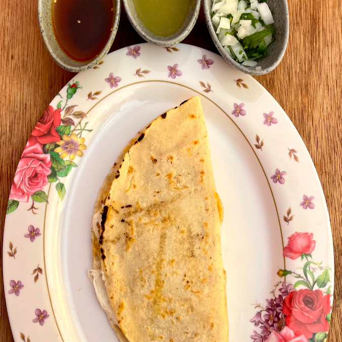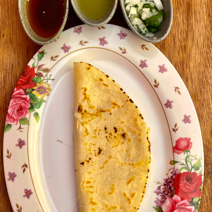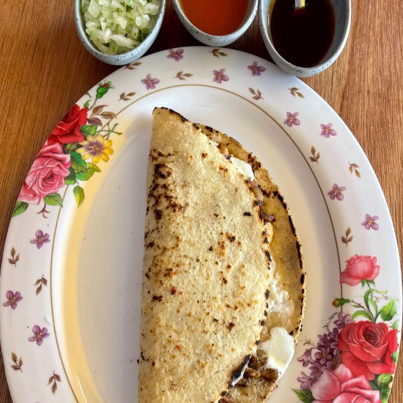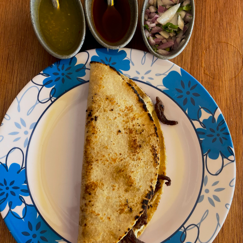 Quesadilla de carne de arrachera al comal con tortillas hechas a mano de maíz