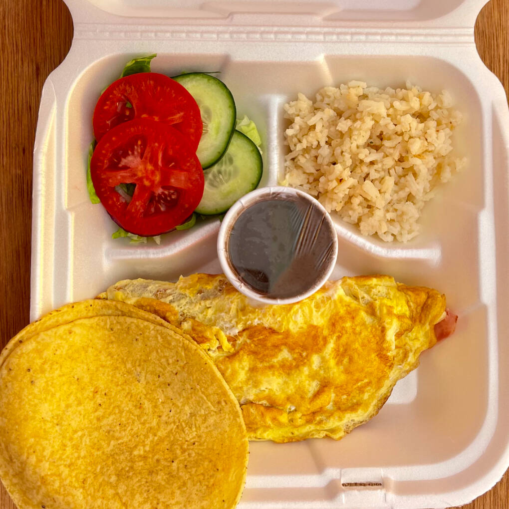 Omelette de champiñones con queso, tortillas, frijol y ensalada.