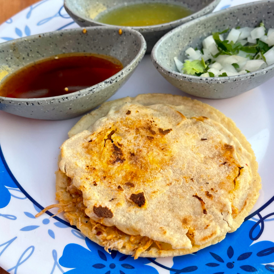 Gordita de deshebrada de carne de cerdo, preparada al comal con tortillas de maiz.