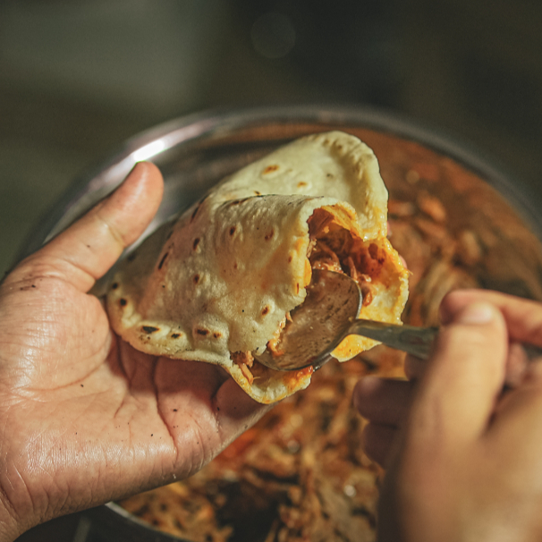 Hecha al comal con tortillas, la Gordita de birria viene acompañado con su respectivo caldo.