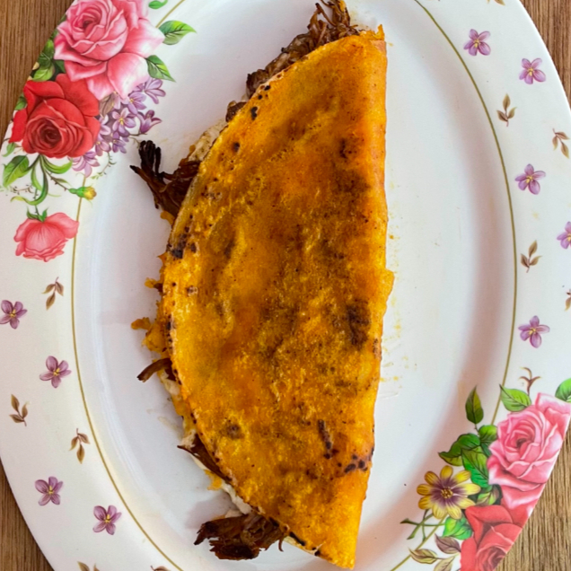 Quesabirria al comal con tortilla hecha a mano y carne de res.