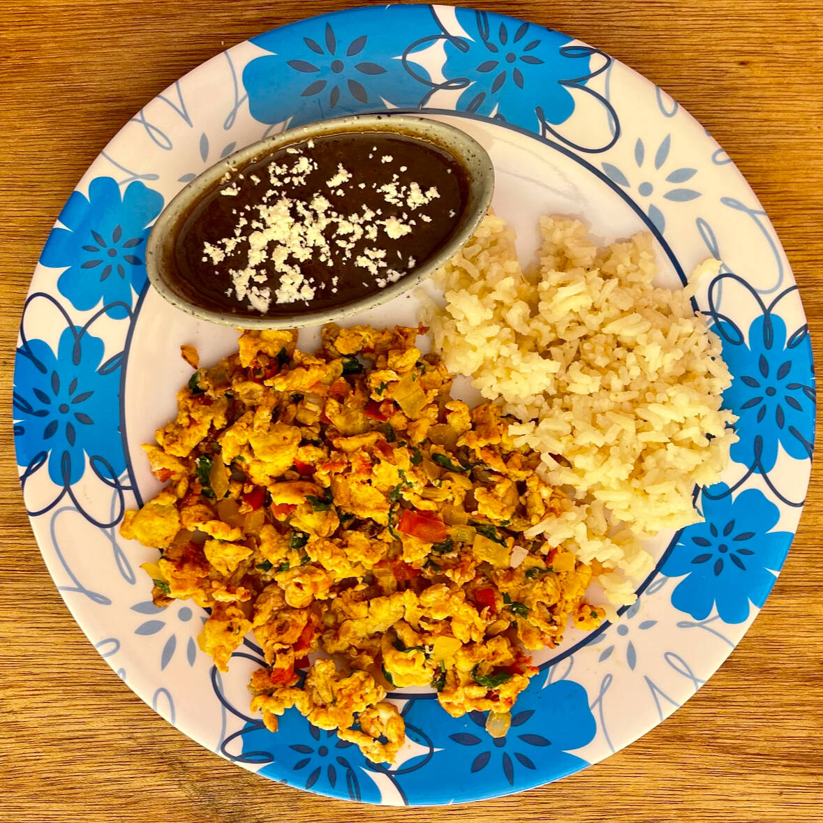 Huevos a la mexicana acompañados con arroz y frijoles gratinados con queso