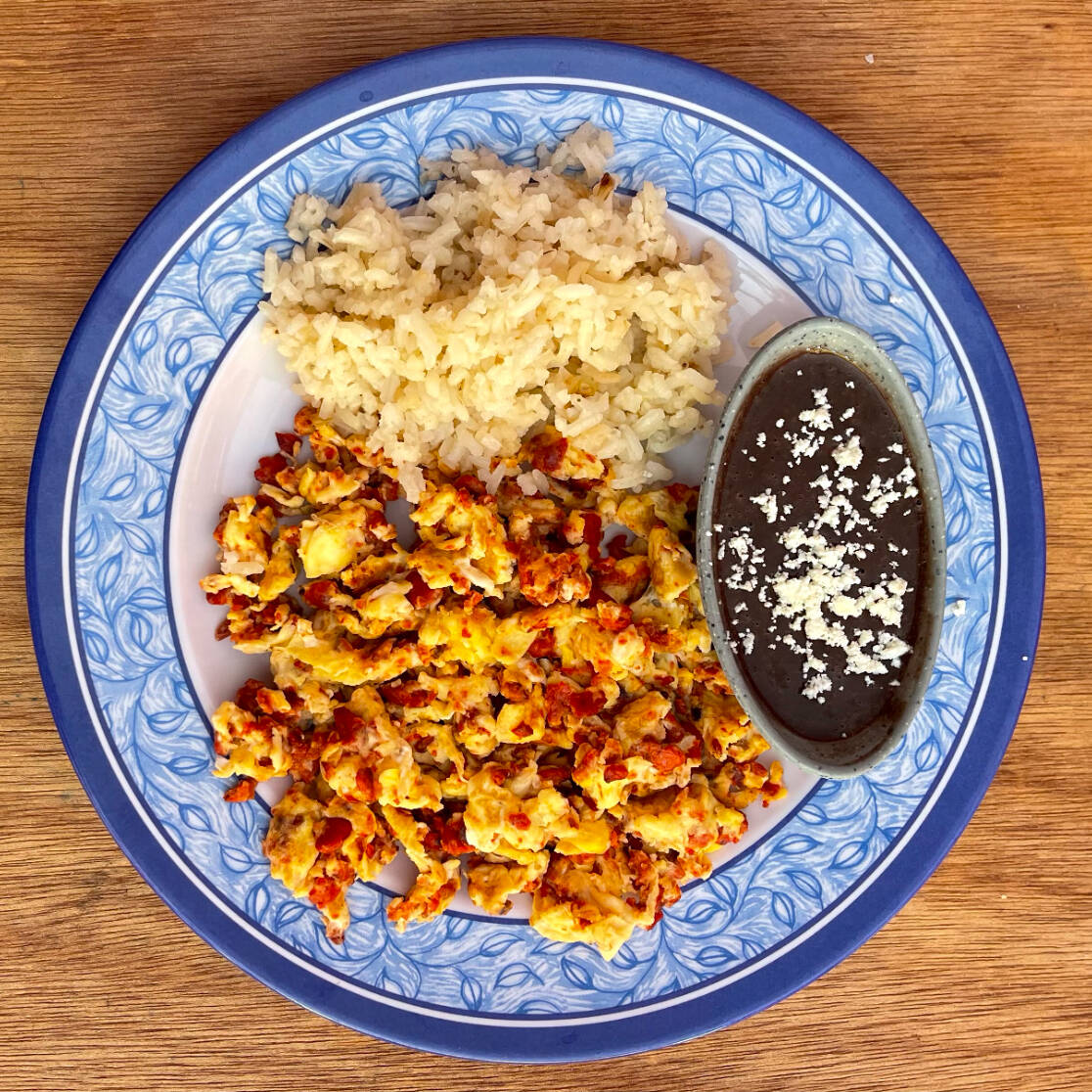Huevos con chorizo acompañados con arroz y frijoles gratinados con queso.