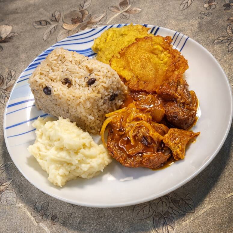 Arroz con coco estilo Barranquilla, acompañado por cerdo guisado con salsa barbecue, patacones y puré de papa.