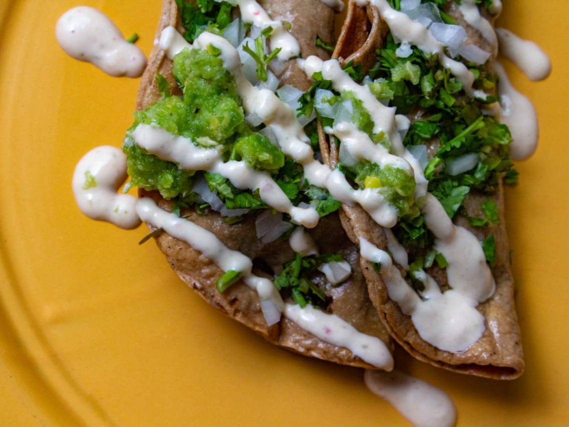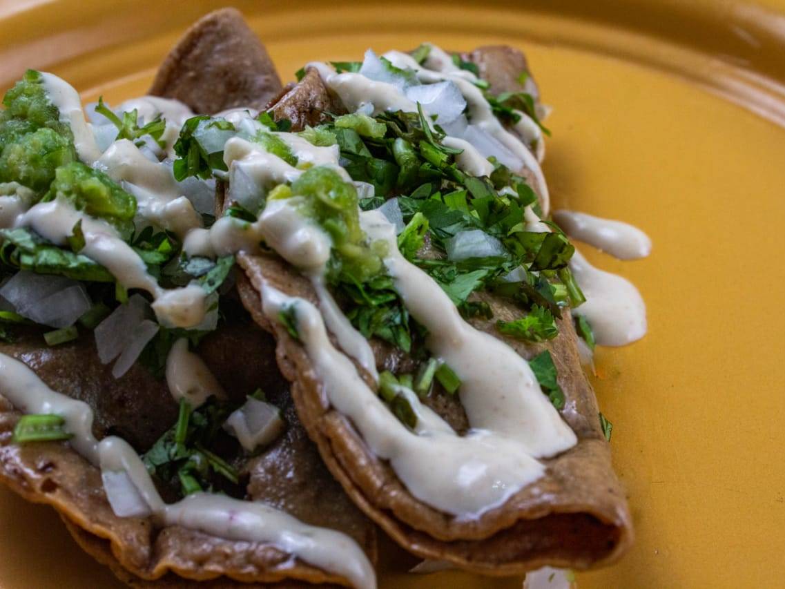 Acompañadas con, salsas, cebolla con cilantro, limon, crema de ajo y tortillas
