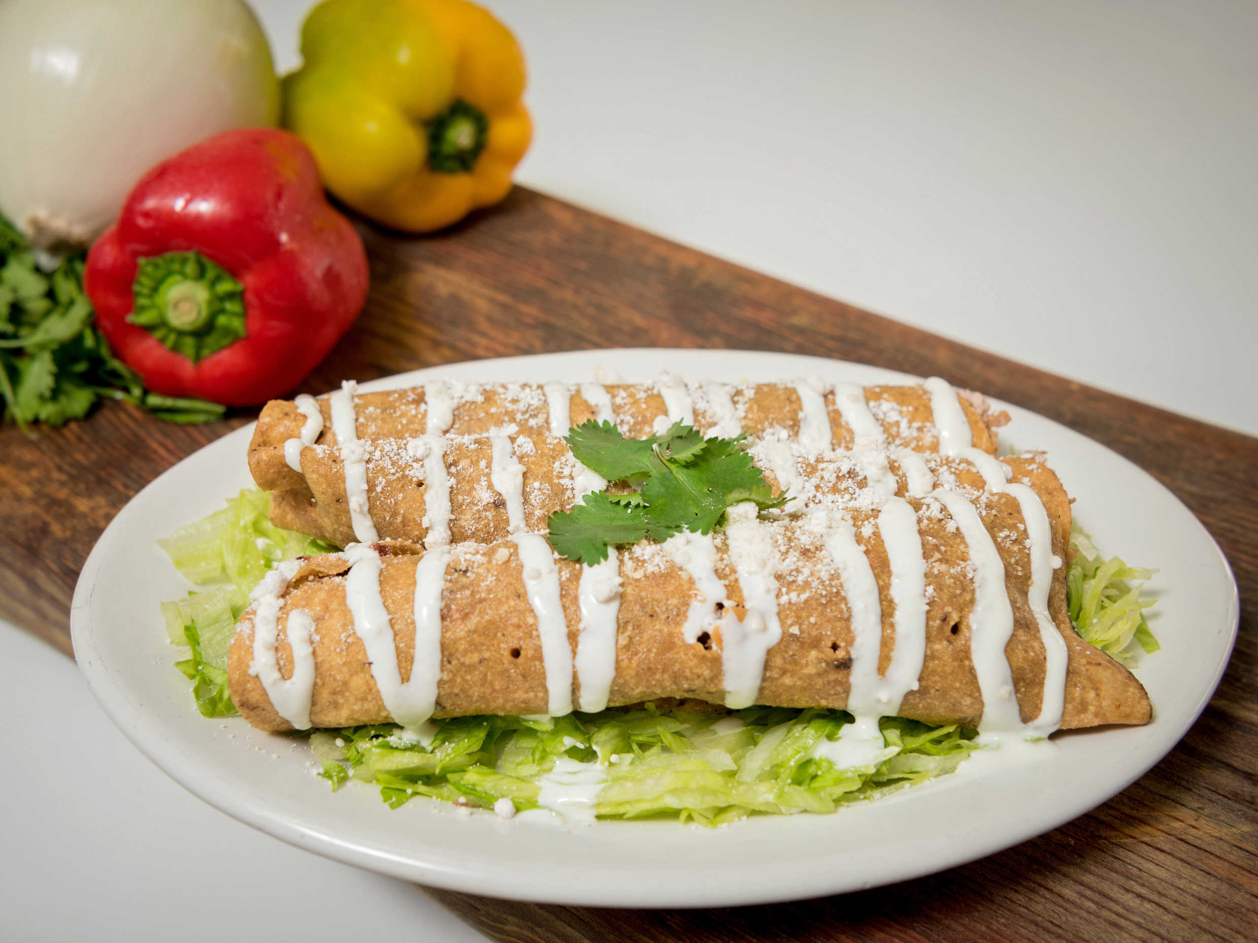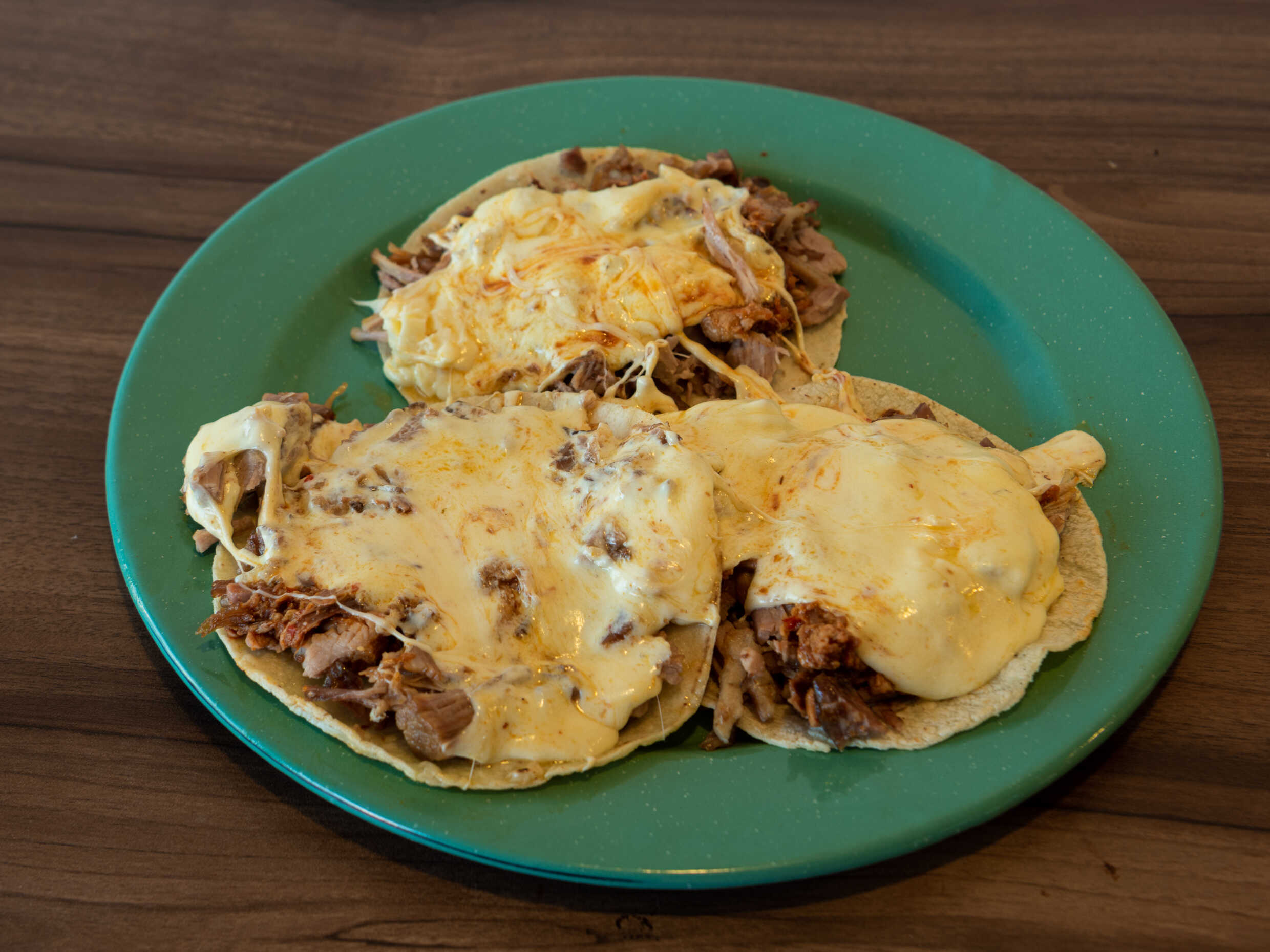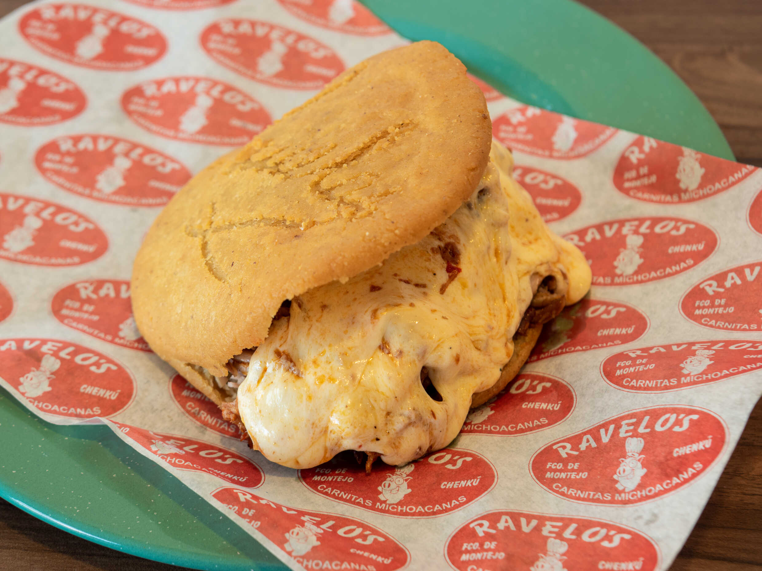 Pan dorado y crujiente, relleno de nuestro chicharrón prensado, gratinado con queso oaxaca