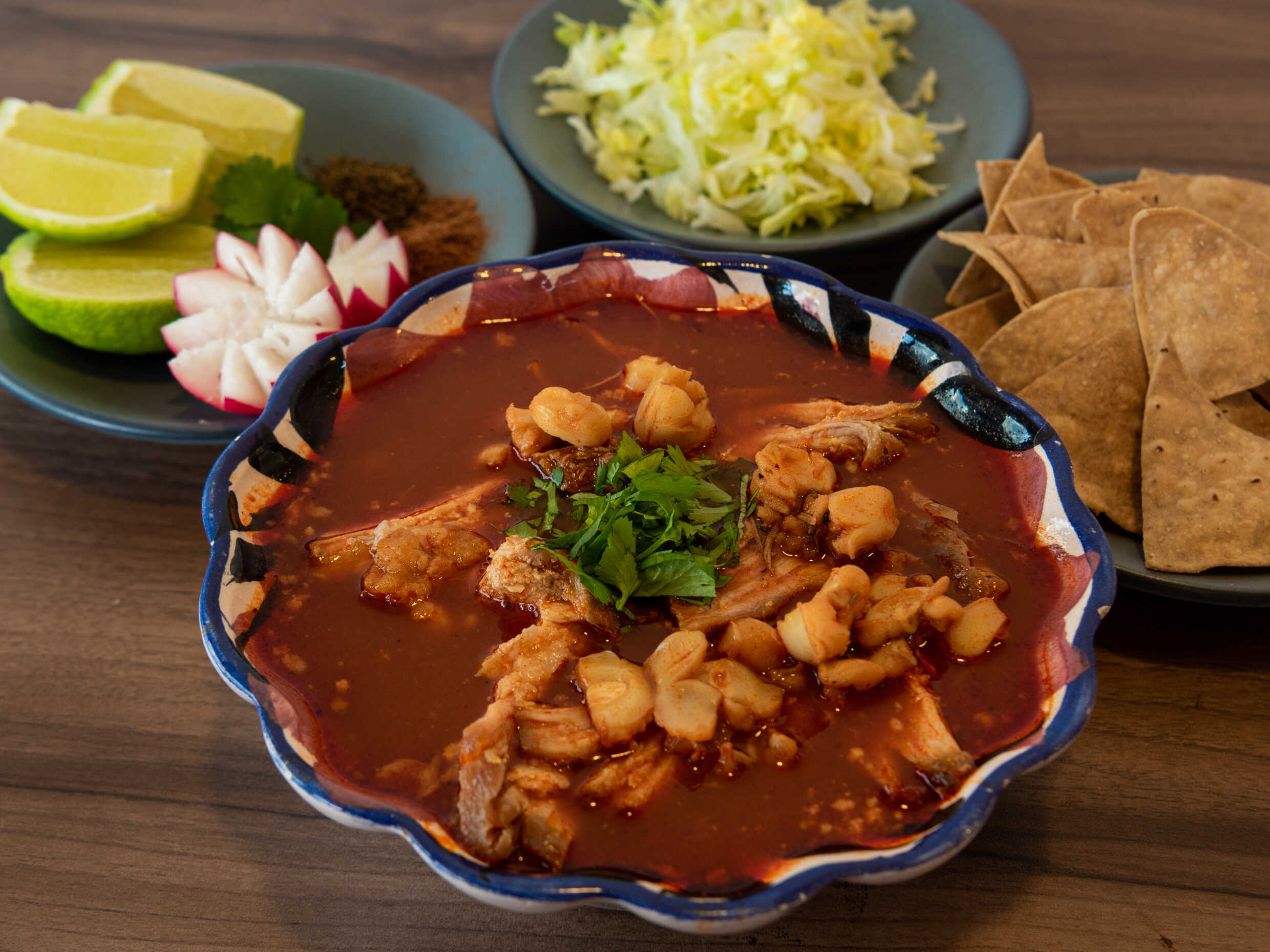 Acompañado de salsa tipo guacamole de habanero, salsa de chile de árbol carenados, cebolla con cilantro, limón y tortilla.