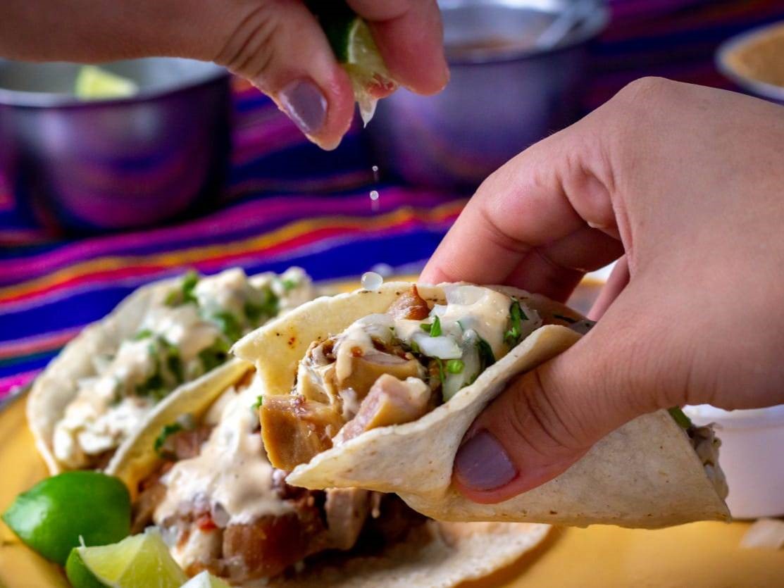 Salsas, cebolla con cilantro, crema de ajo, limón y tortillas.