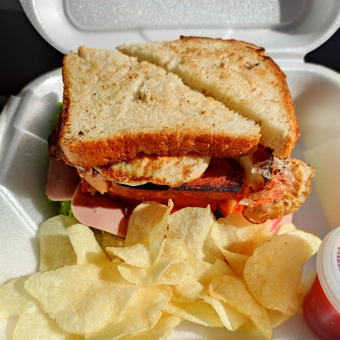 Pan de caja dorado con mantequilla, jamon de pavo, queso americano, lechuga italina , tomate, tenders de pollo, tocino aderezo de la casa y un huevo estrellado ,acompañadop de papas chips