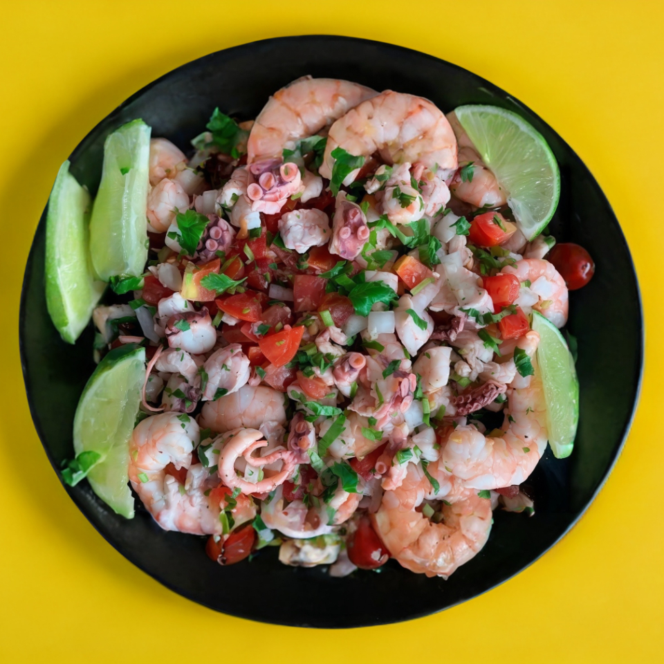 1/4 Ceviche de mixto, tostadas, salchicha a la diabla. incluye bebida de 500ml