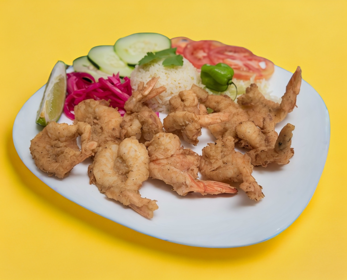 camarones empanizados, arroz, guarnicion verduras, tortillas.