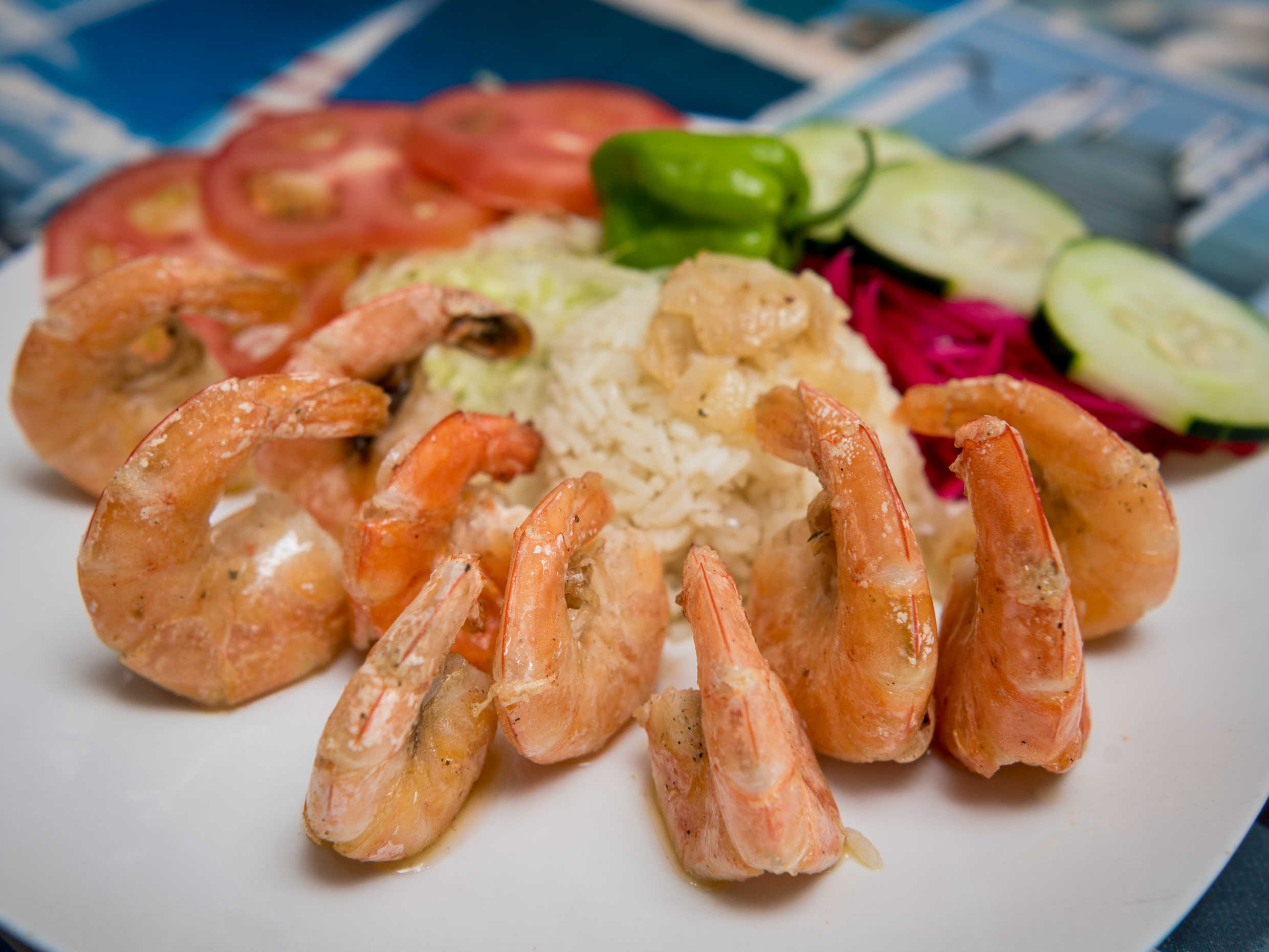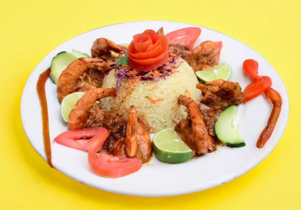 camarones mojo ajo, arroz, guarnicion verduras, tortillas.