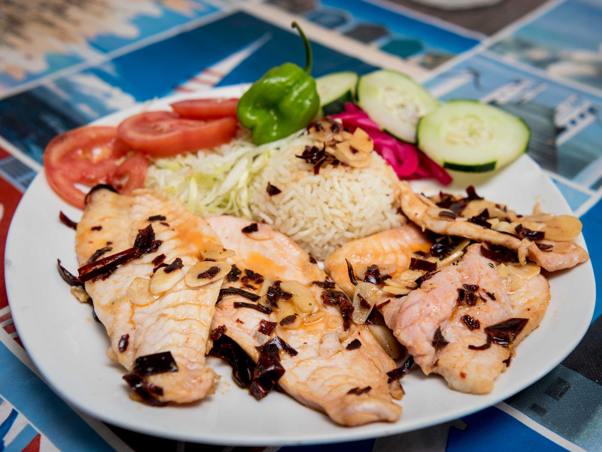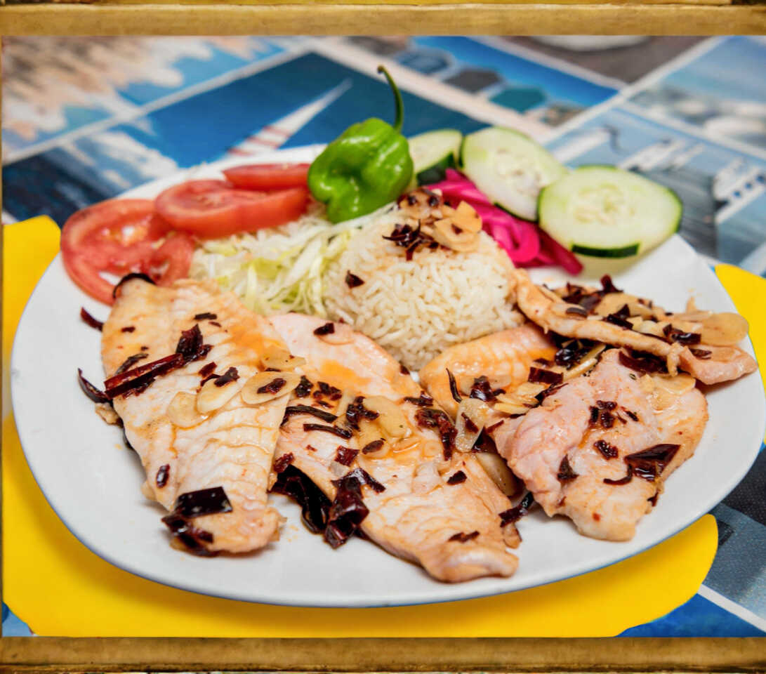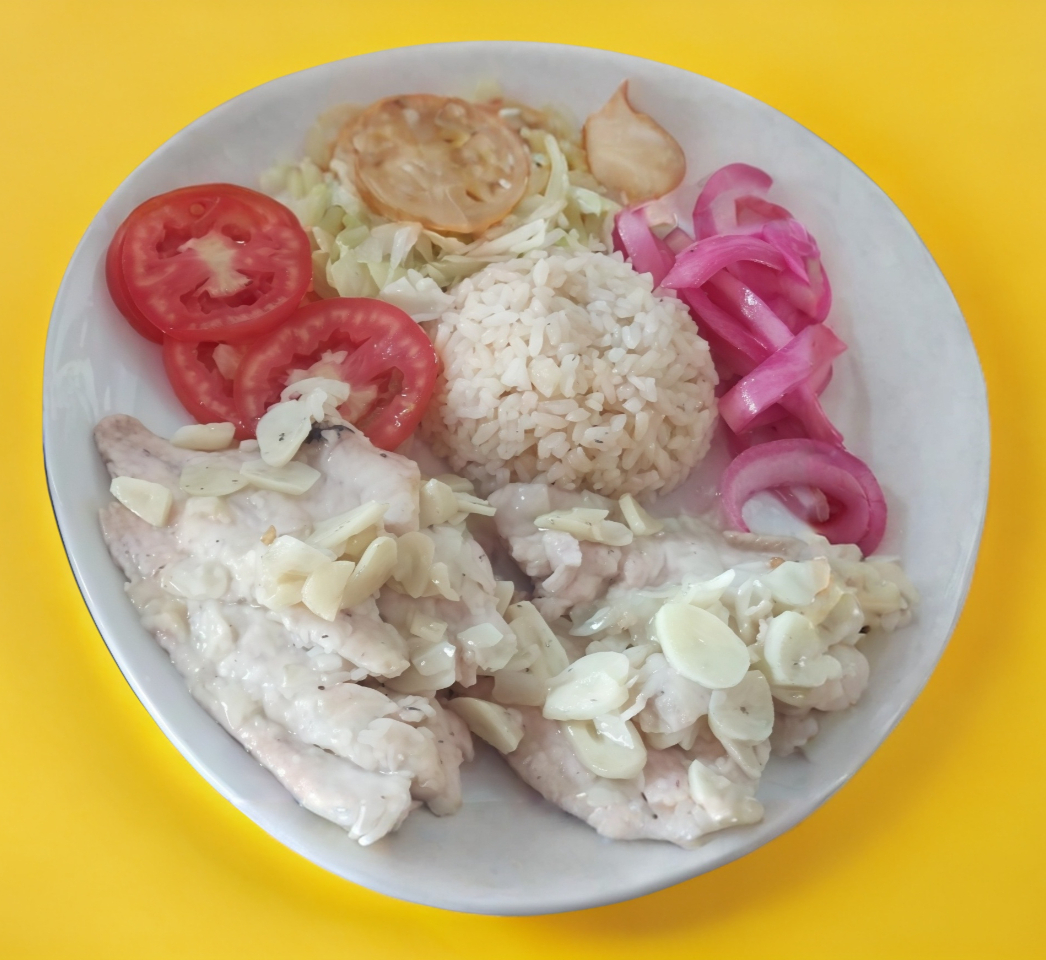 orden de filete pescado al mojo de ajo, guarnicion verduras, arroz, frijol, tortillas
