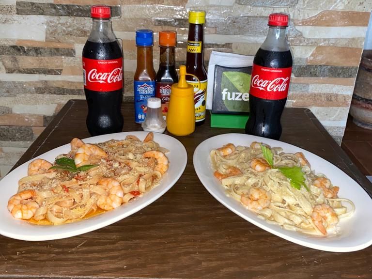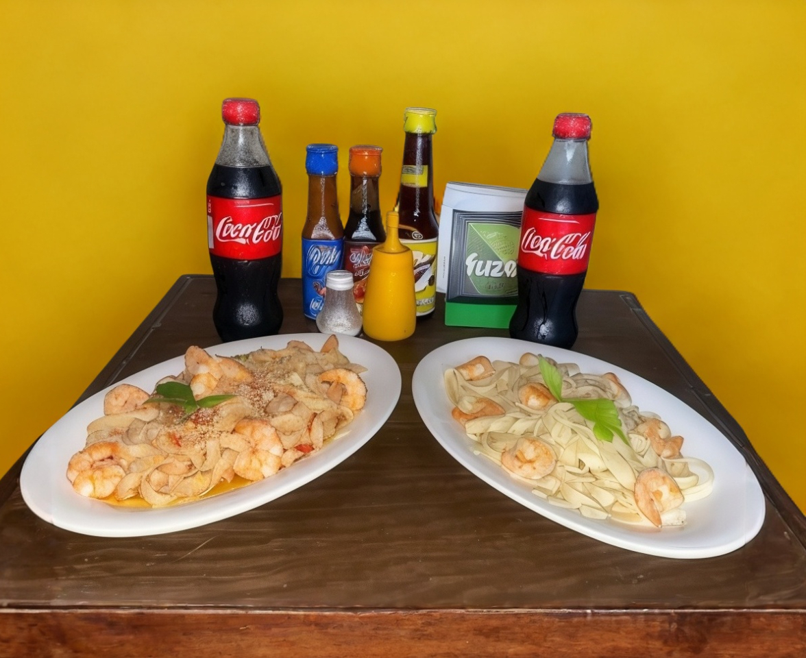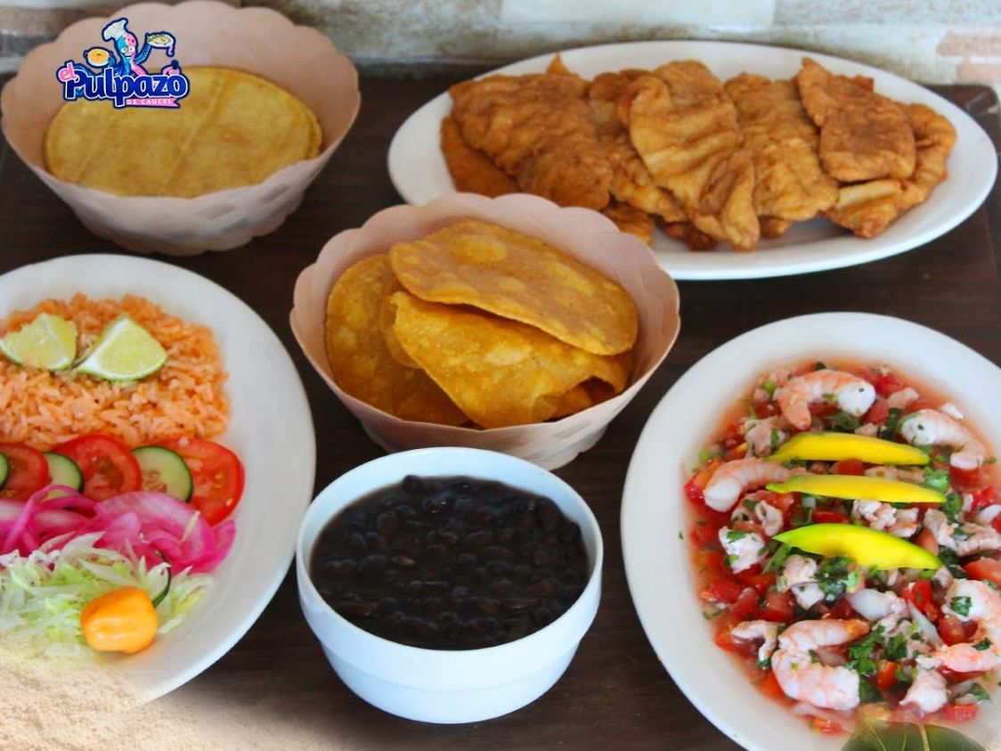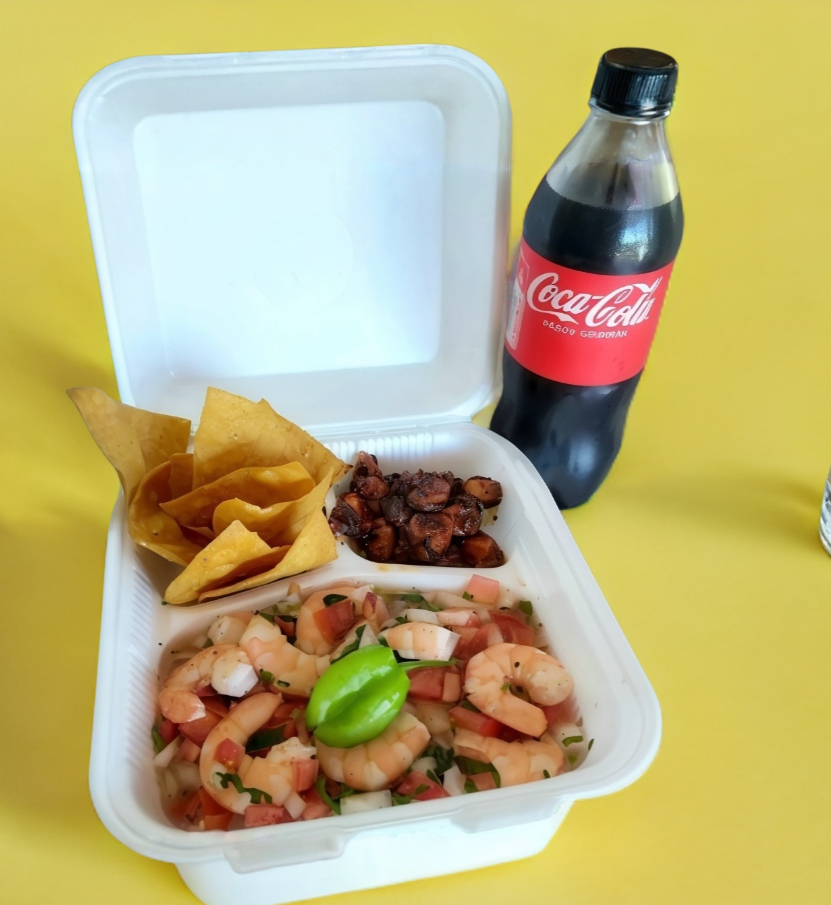 1/2 kilo de filete de pescado, 1/2 kilo de ceviche de pescado camarón, tostadas, guarnición frijol y arroz. incluye Coca-Cola de 1.35l.