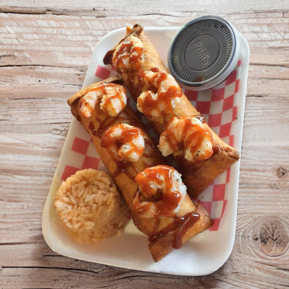 2 pz de burritos de camaron con queso, s envia aparte salsa tamarindo chipotle y bbq acompañadop de una guarnicon de arroz