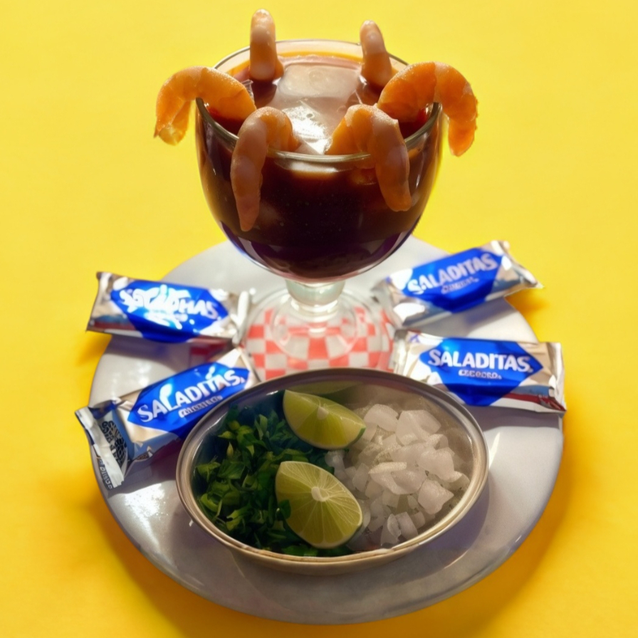camarones, preparado coctelero. aparte cebolla picada con cilantro y galletas saladas.