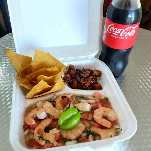 1/4 Ceviche de Camaron, tostadas, salchicha a la diabla. incluye bebida de 500ml