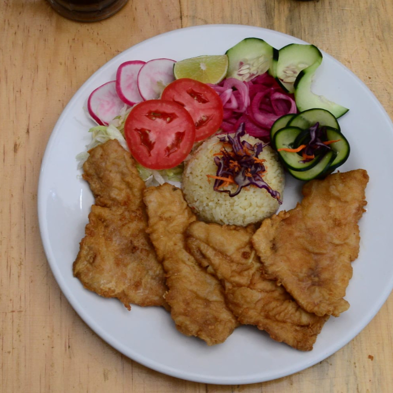 orden de filete pescado empanizado, guarnicion verduras, arroz, frijol, tortillas