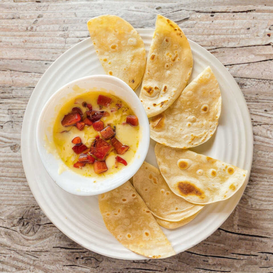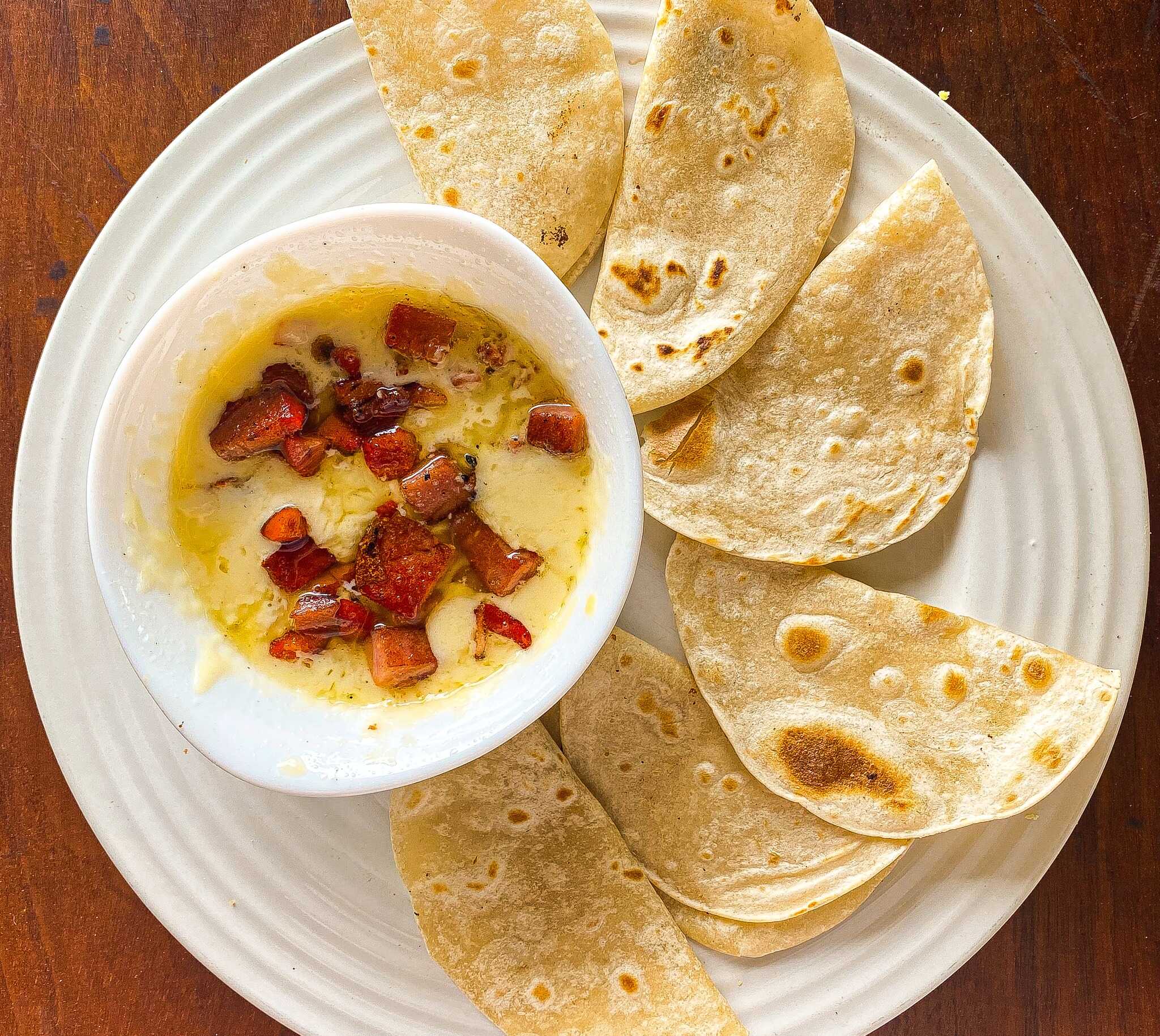 Delicioso Queso de bola "Edam" gratinado y relleno con carne molida, acompañado con salsa de tomate y kool. Incluye tortillas a mano