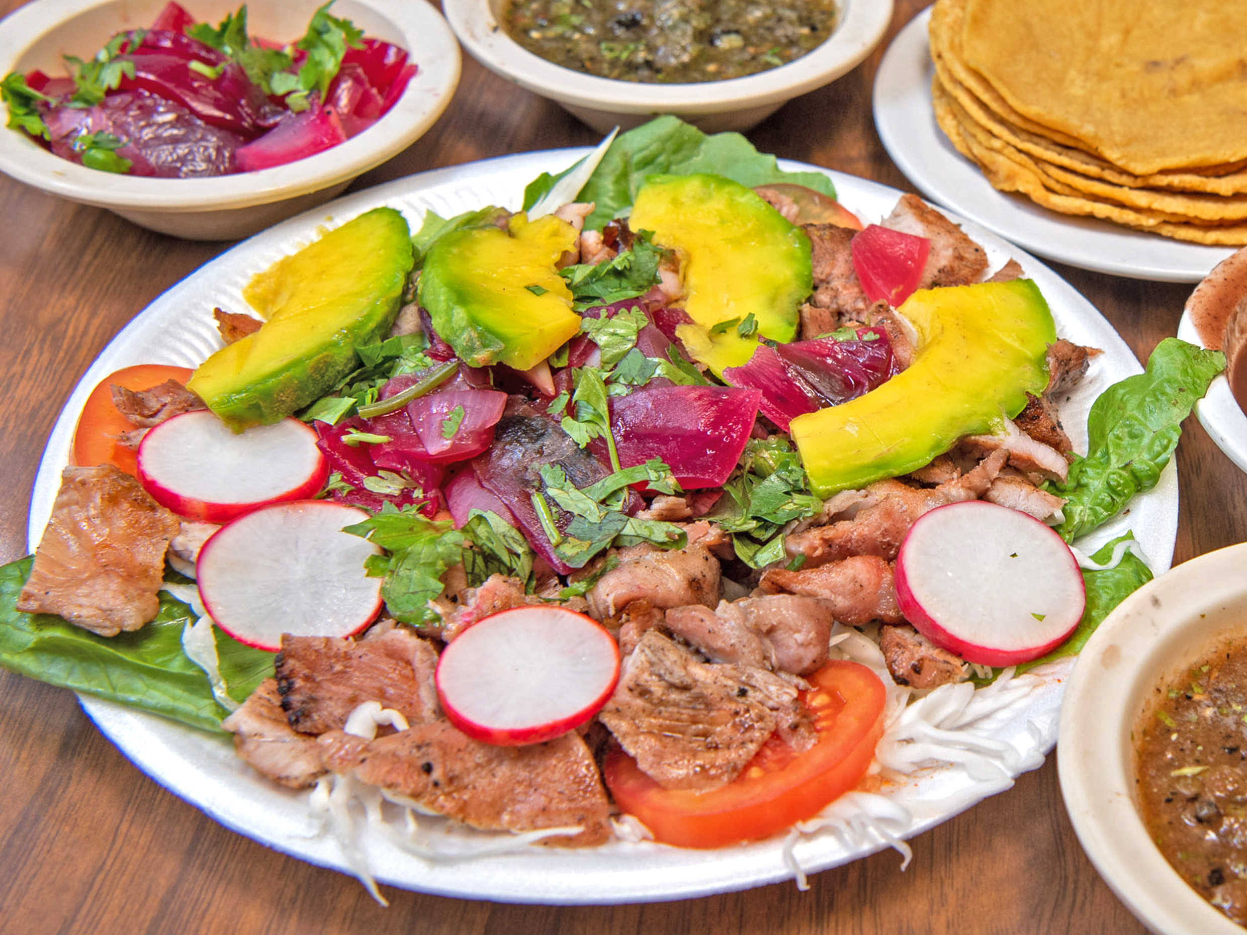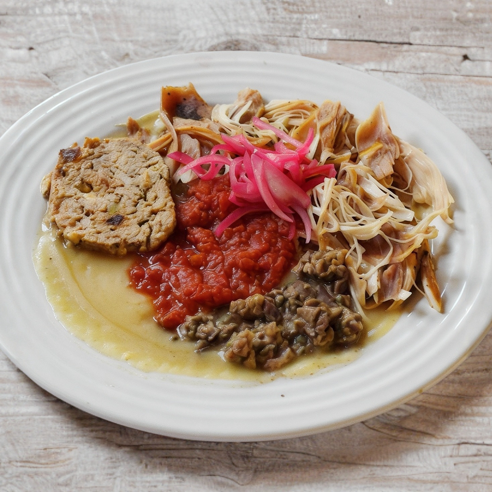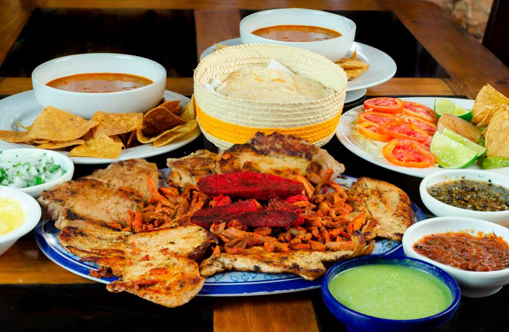 Charola con tres carnes: Pechuga de pollo, Chuleta y Poc-chuc acompañado de guacamole, romanita, carbolla, frijol colado y tortillas a mano.
