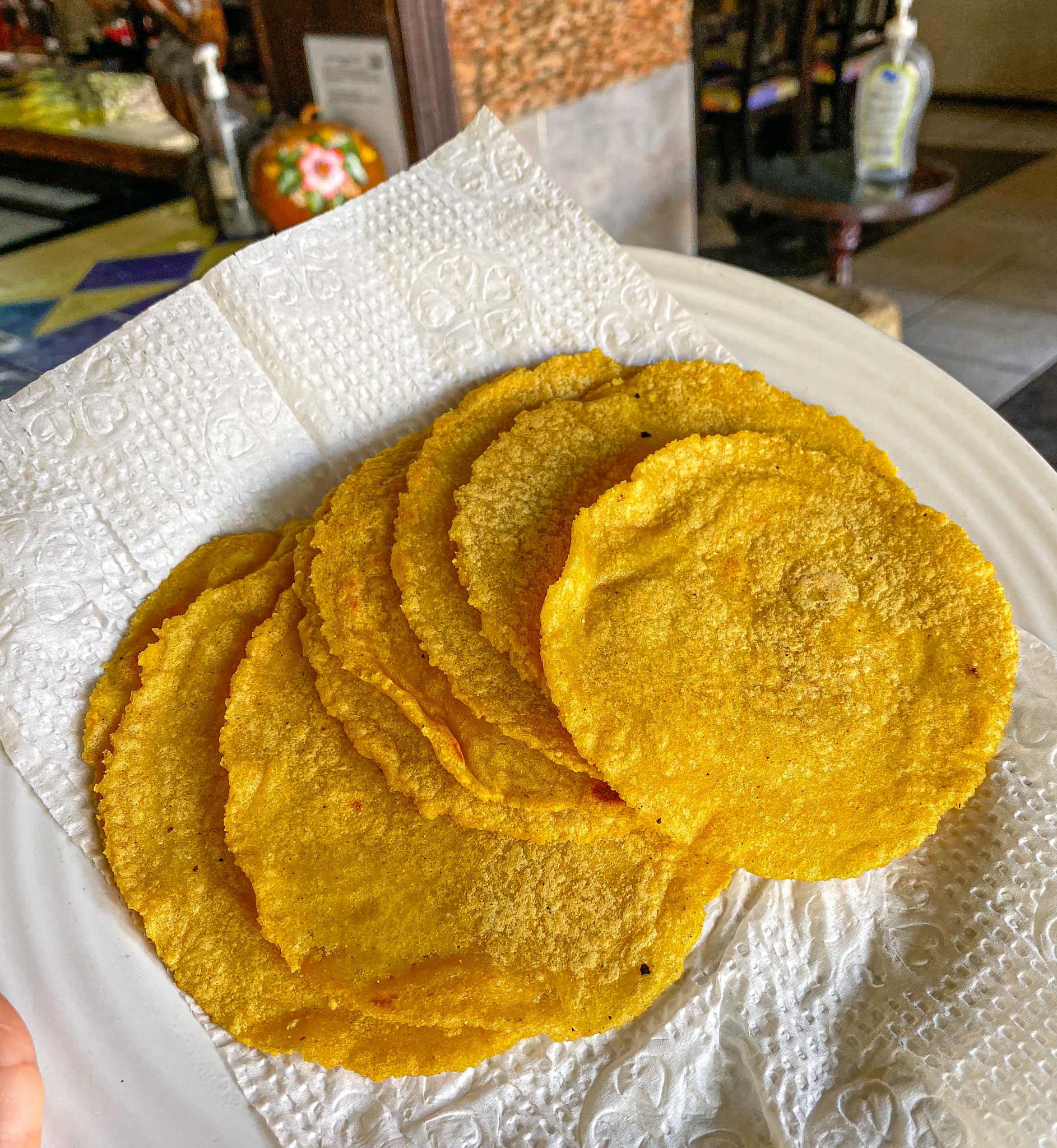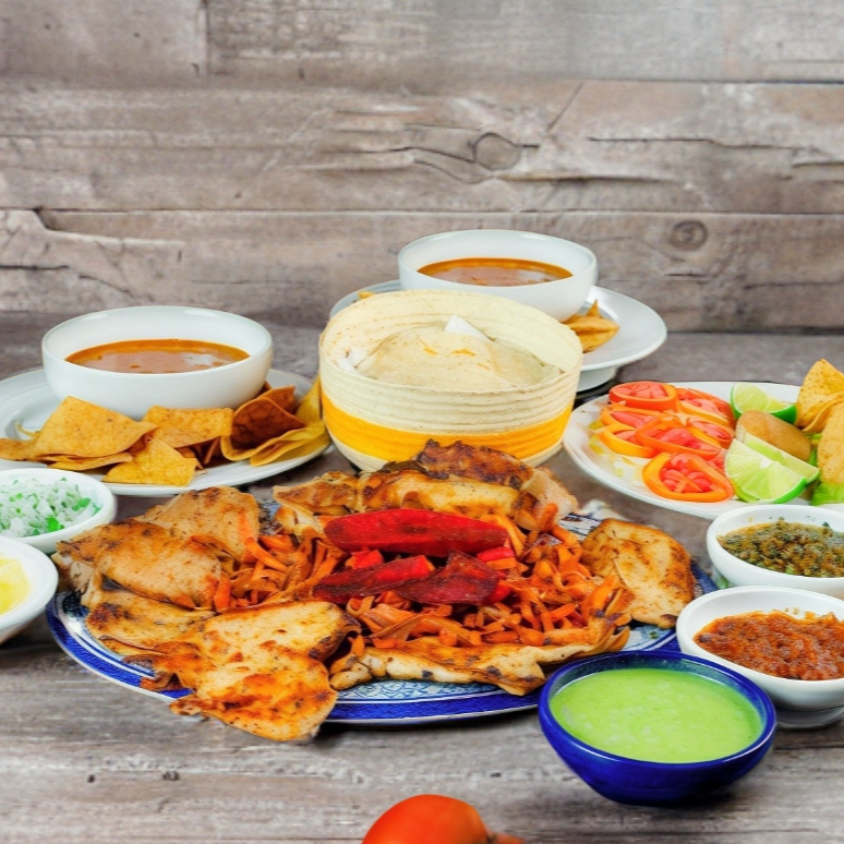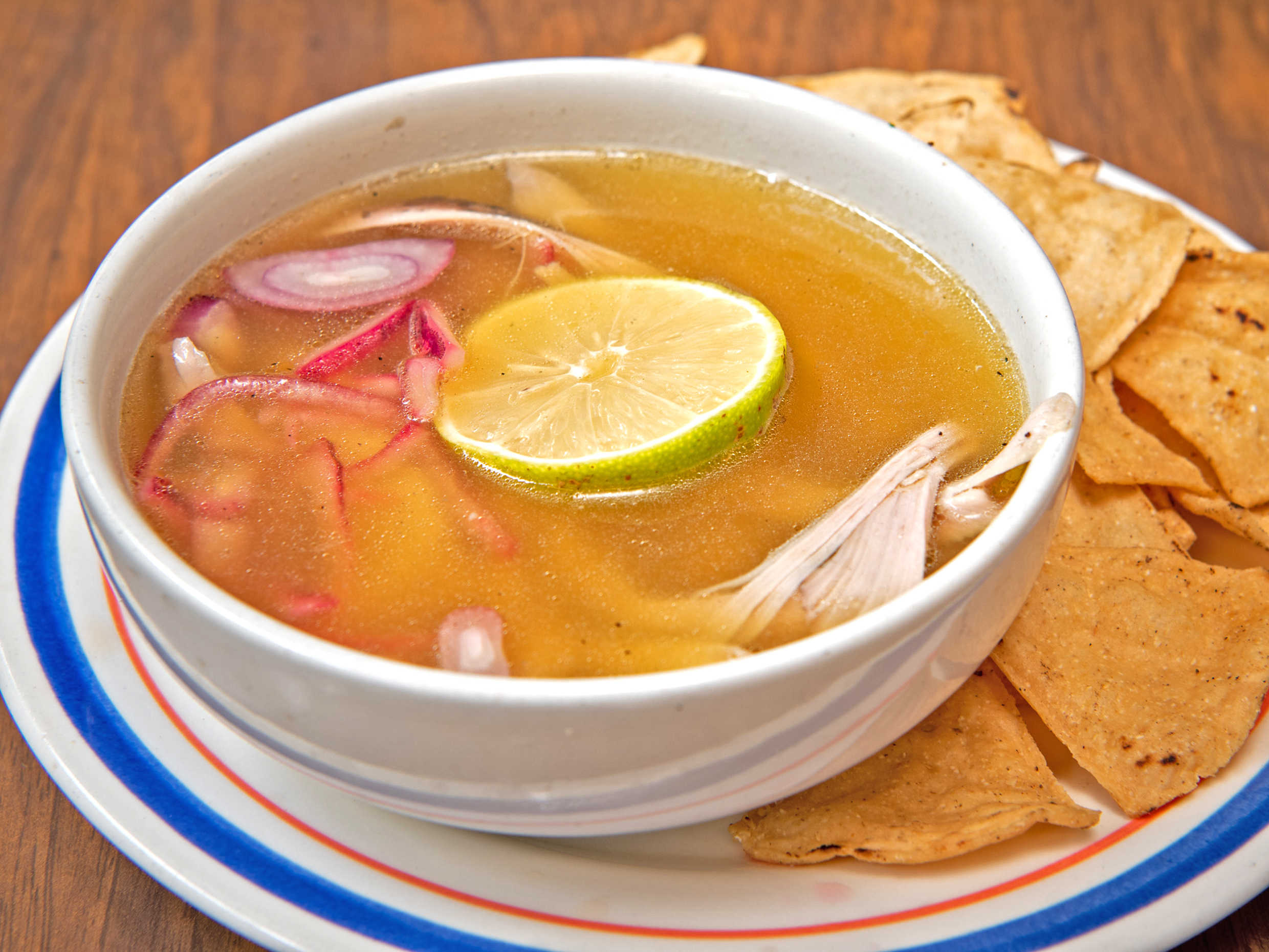Tradicional caldo de pavo con un toque de jugo de lima, acompañado de carne de pavo, servido al lado de crujientes tostadas de maíz ligeramente saladas. Inluye tortillas a mano