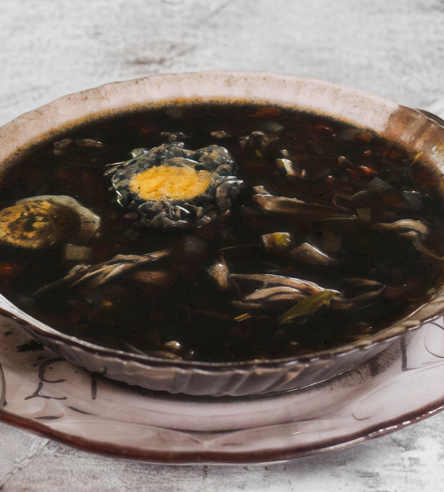 También conocido como chilmole, su color negro viene de la mezcla de chiles secos, acompañado de carne de pavo, chin y but preparado con carne molida de cerdo, huevo sancochado y especias. Incluye tortillas a mano