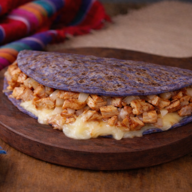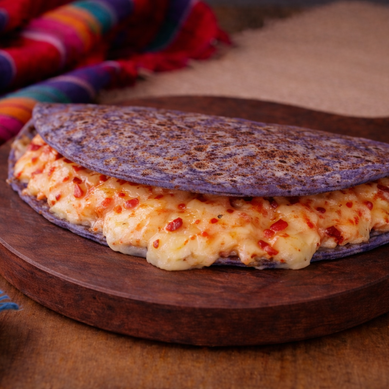 Quesadilla grande elaborada con masa azul, dorada al comal y rellena de chicharrón prensado guisado con cebollita y queso Oaxaca fundido. Se acompaña con: 🌶 Salsa roja de habanero 🌿 Salsa verde de la casa 🧄 Crema de ajo especial 🧅 Cebolla curtida Una combinación intensa, cremosa y llena de sabor en cada mordida.