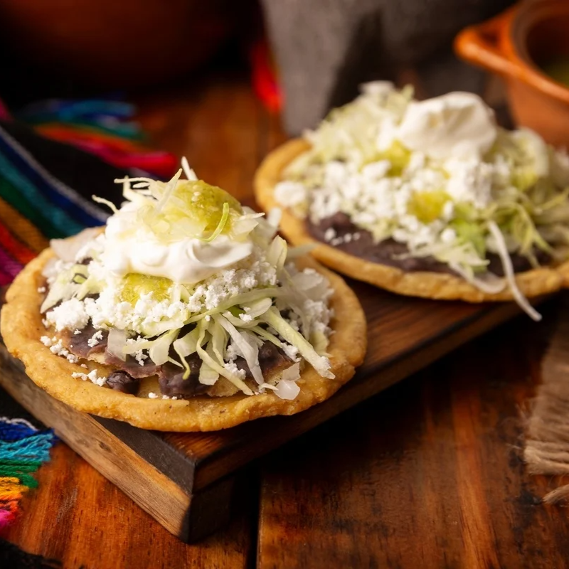 Sope artesanal individual, elaborado con masa de la casa, prensado y dorado al momento. Base de frijoles refritos hechos en casa, acompañado de col fresca, queso fresco, crema y salsa verde. Se sirven con cebolla salteada para realzar el sabor. Incluye bolsita de salsa verde y salsa de ajo para acompañar. Antojito casero, bien servido