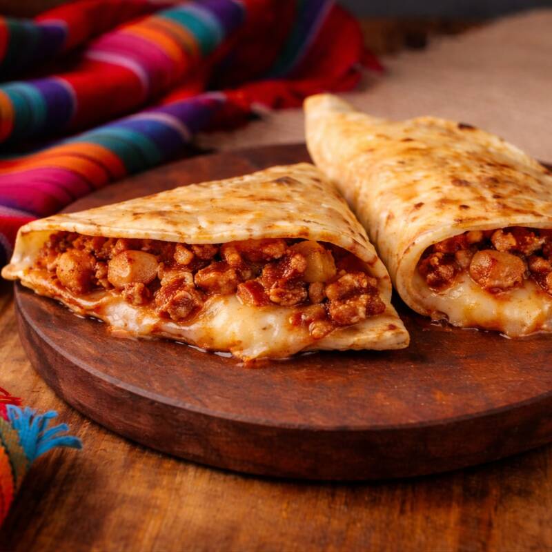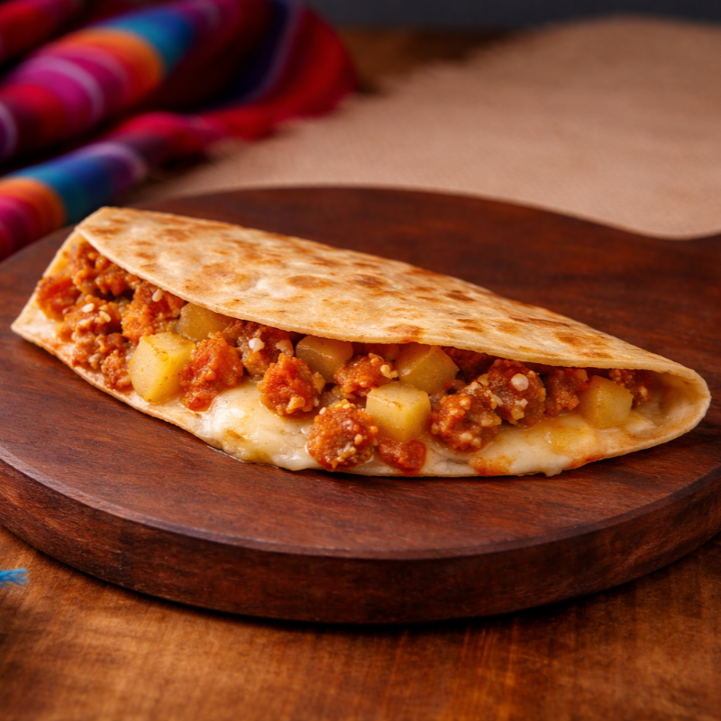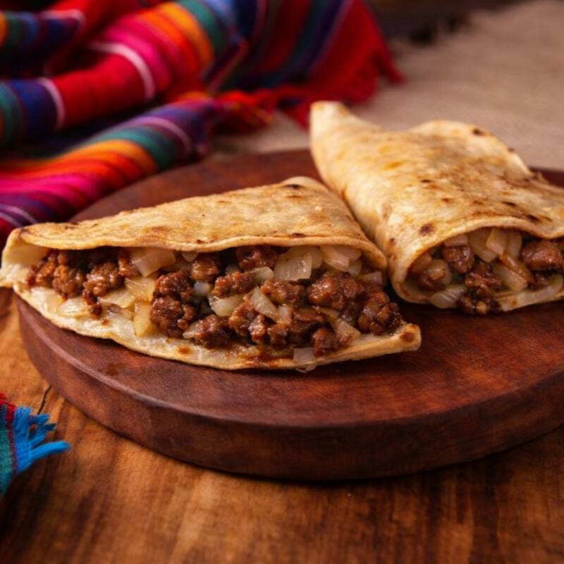Quesadilla artesanal elaborada con tortilla especial de la casa, dorada al momento. Rellena de carne a elegir, preparada al estilo tradicional y acompañada de cebolla salteada, que realza el sabor de la carne. Jugosa, bien servida y con un toque casero que recuerda a un taco recién hecho, pero en versión quesadilla. Se acompaña con crema de ajo y salsa verde picosa.