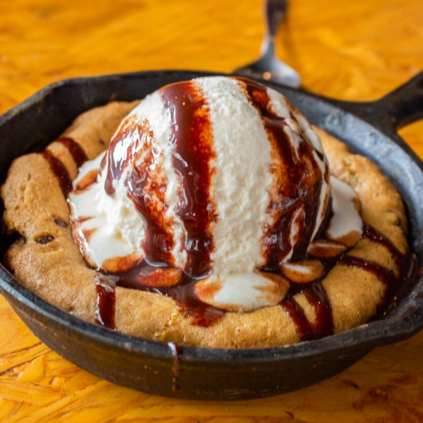 Galleta con chispas de chocolate servida en un squillet caliente, acompañada de helado de vainilla y jarabe de chocolate.