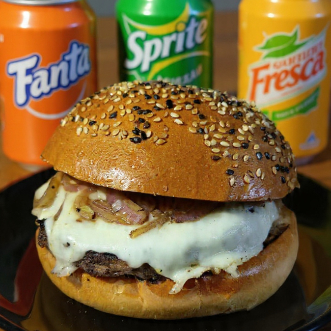 Deliciosa burger con carne de res, jamon, queso manchego, cebolla asada, lechuga, jitomate, mayonesa, catsup