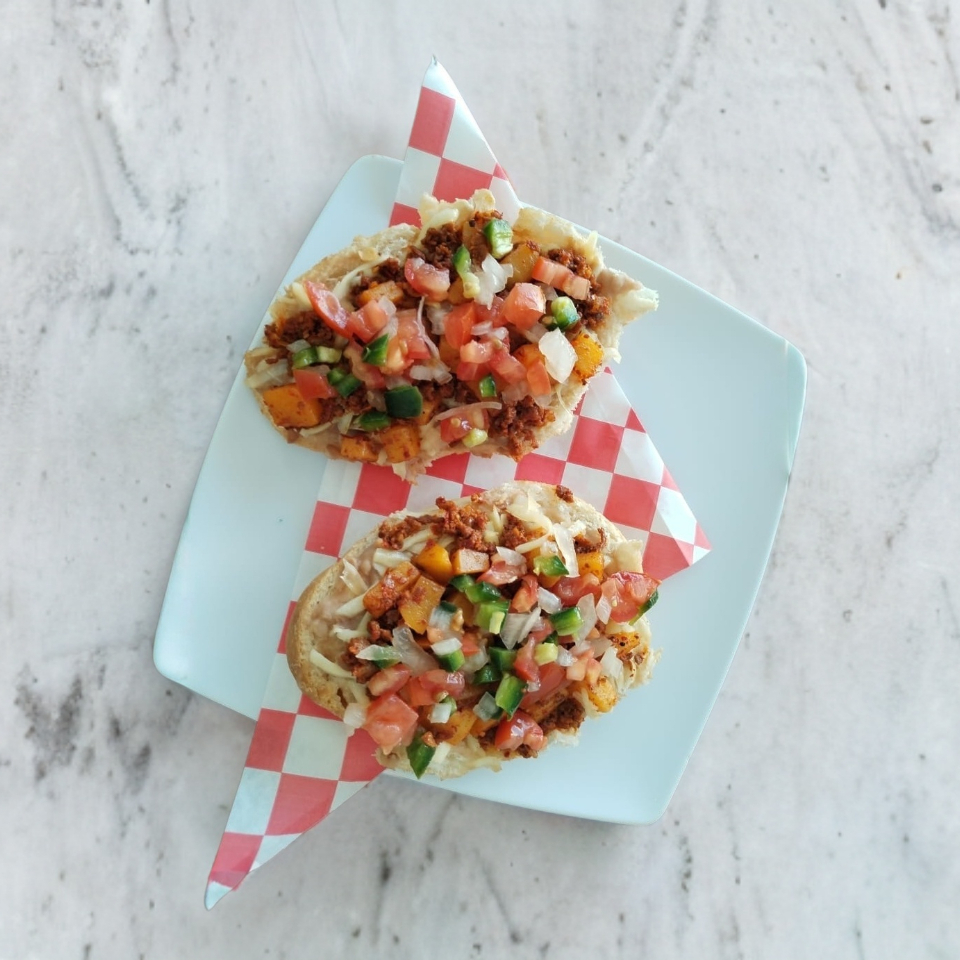 Pan bolillo con frijoles, papas con chorizo, queso y pico de gallo