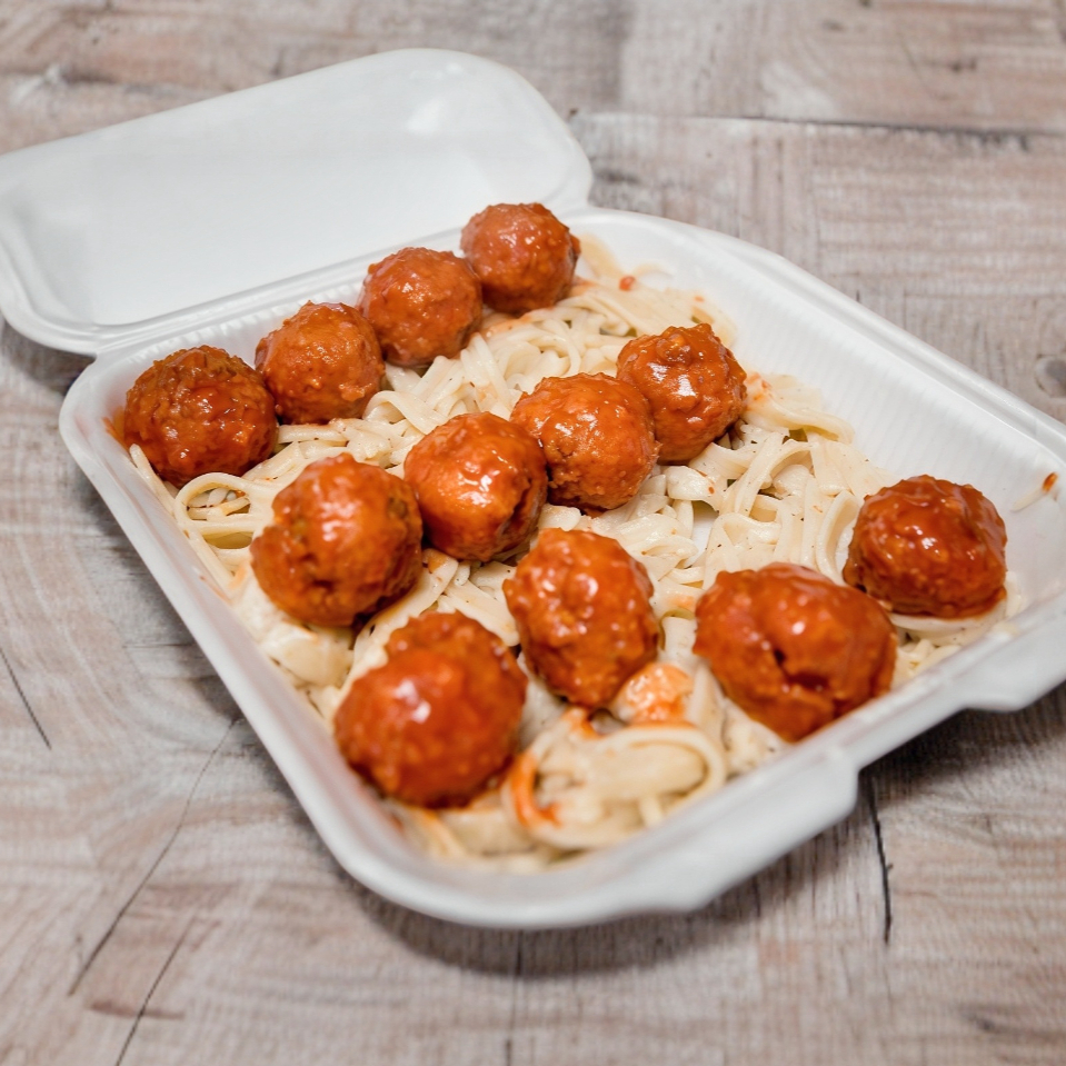 Pasta en salsa alfredo (250 g), proteína a elección y el aderezo de tu preferencia. (Porción personal)