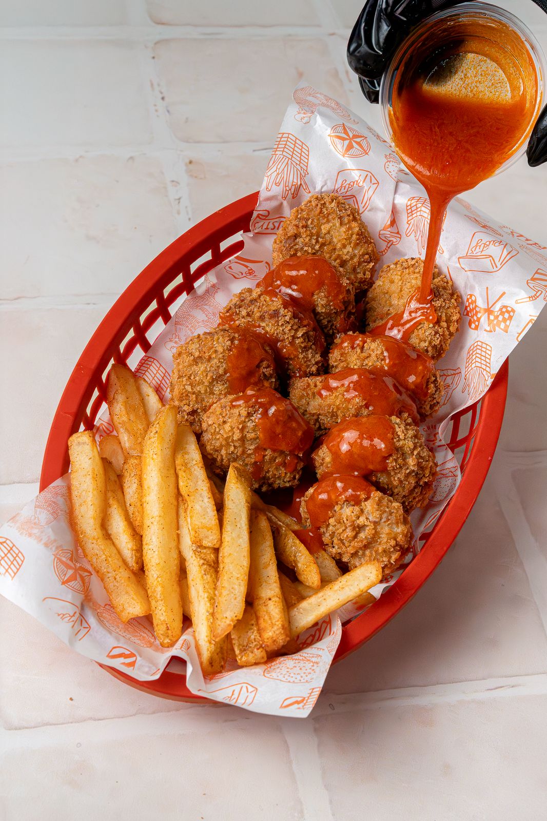 Deditos de pollo acompañados de nuestra especial salsa Rusty’s y papas a la francesa.