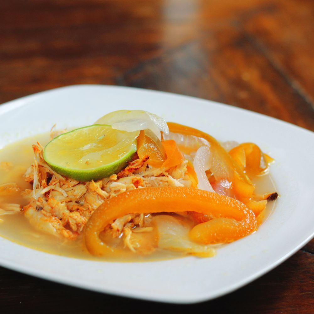 Caldo de pollo, cebolla, pimiento, jugo de lima, pollo deshebrado y julianas de tortilla frita.