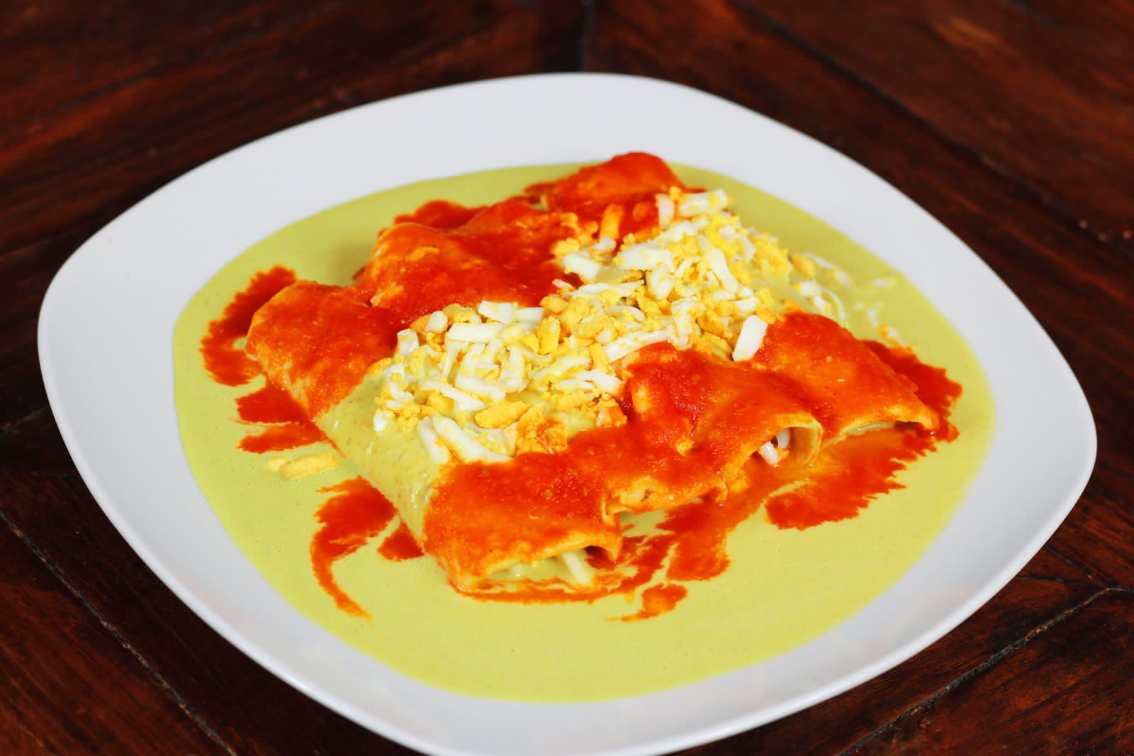 (4 pz) Tortillas rellenas de pollo bañadas en mole, acompañadas de media crema, queso sopero, ajonjolí y cebolla.