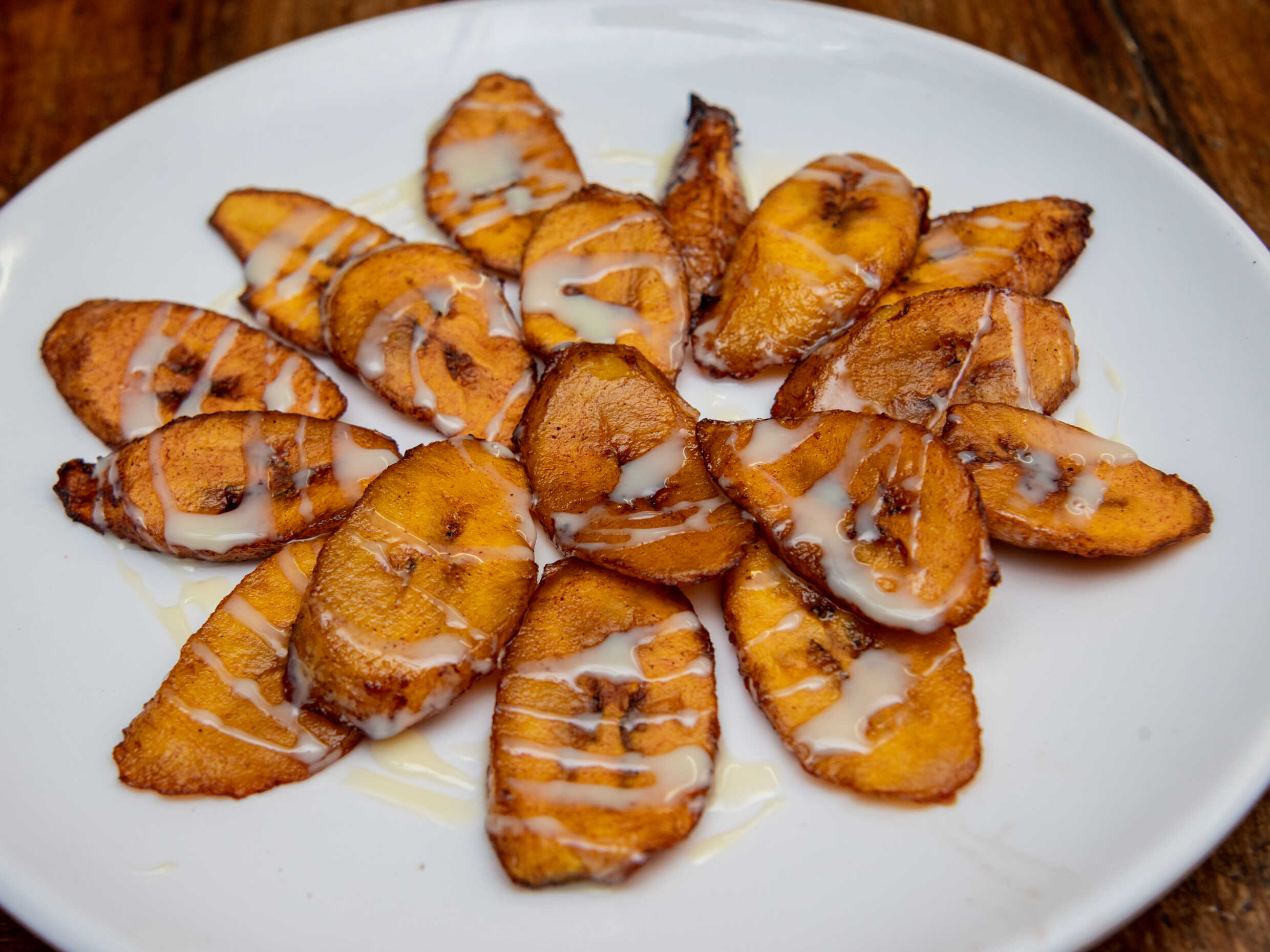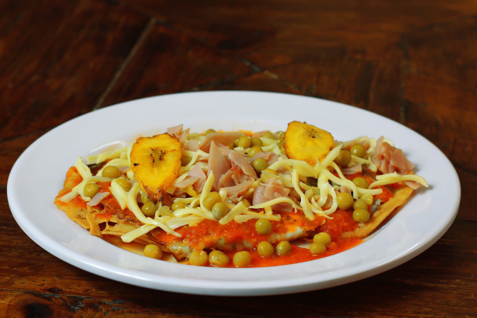 3 piezas de tostada, 3 piezas de huevo estrellado, frijol, salsa de tomate, jamón, queso, chícharos y plátanos fritos.