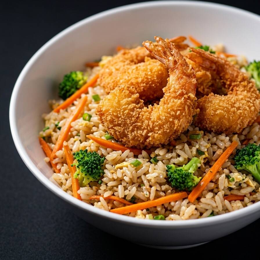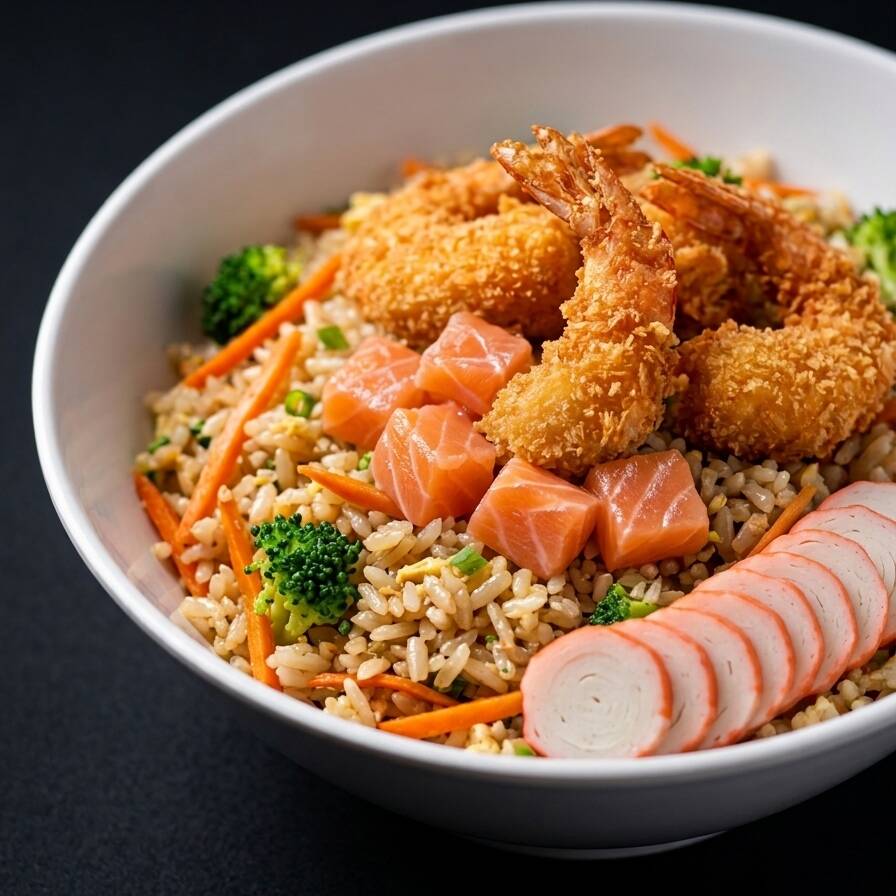 Arroz frito en Soya, con Zanahoria y Brócoli, Salmón, Surimi y Camarón Empanizado