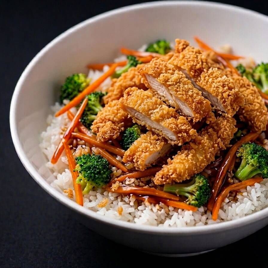 Arroz frito en Soya, con Zanahoria y Brócoli, proteína empanizada