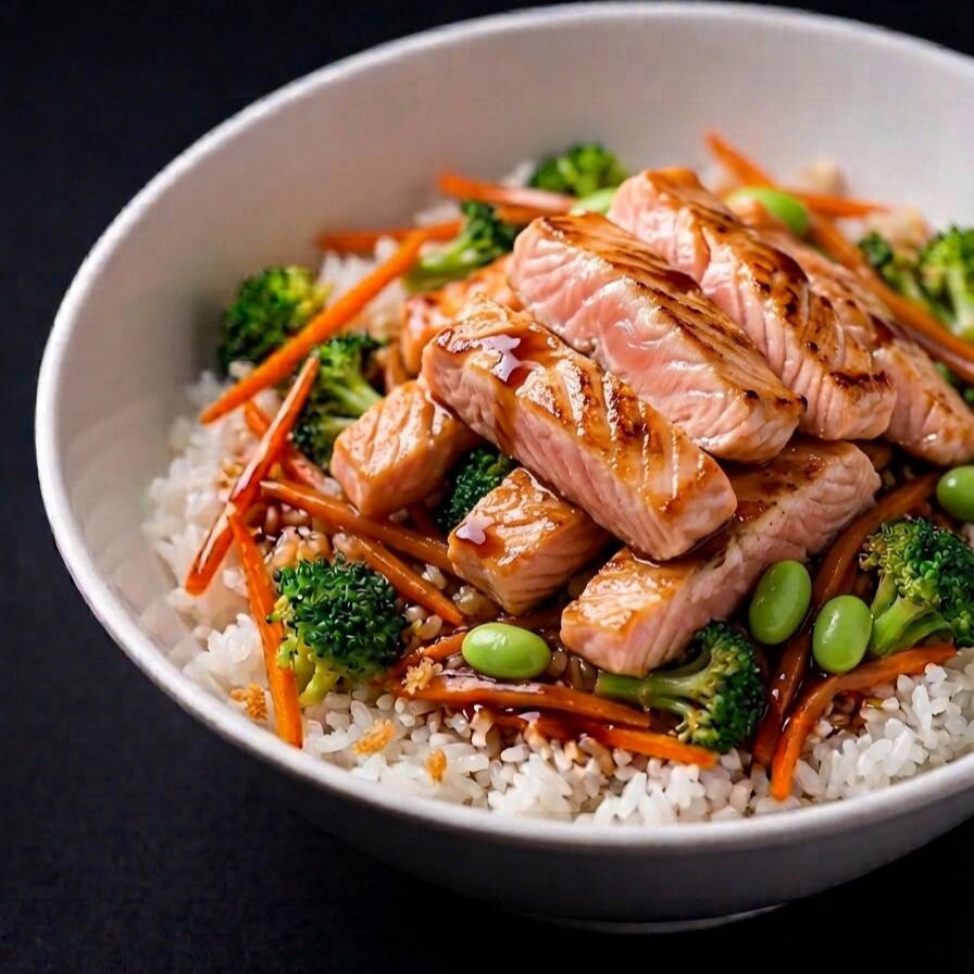 Arroz al Vapor, Brócoli y Zanahoria salteados en Soya, Proteína