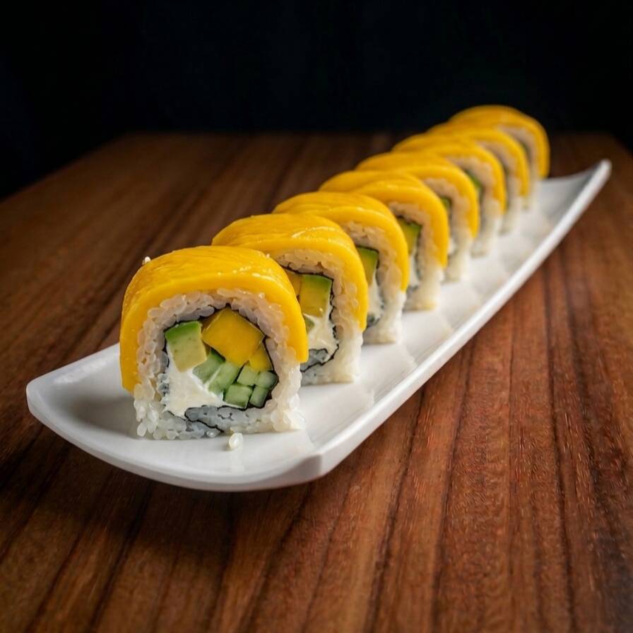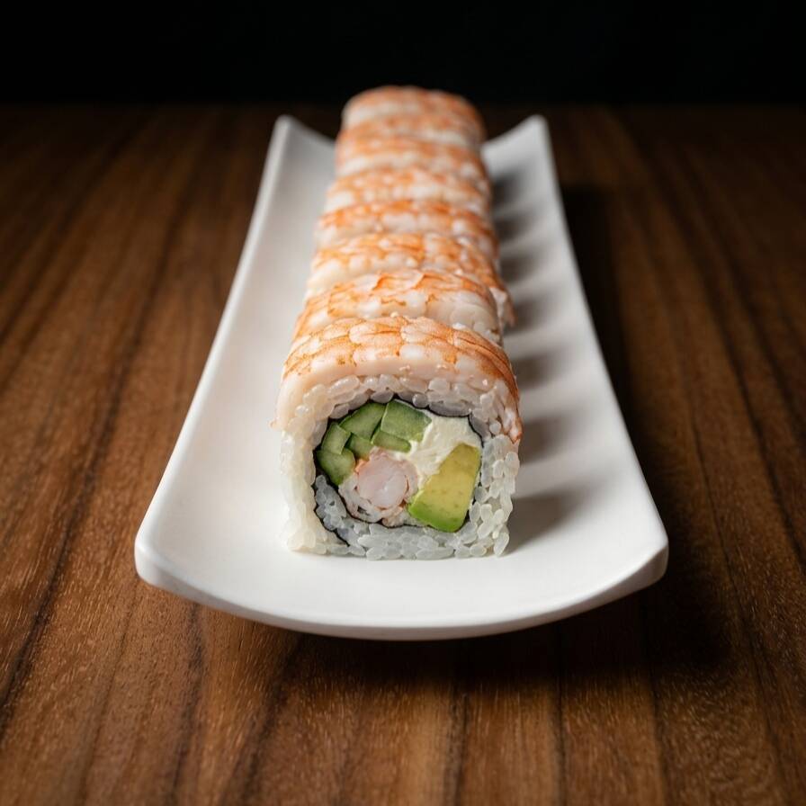PF: Camarón. PD: Pepino Aguacates Queso Crema, Alga, Camarón