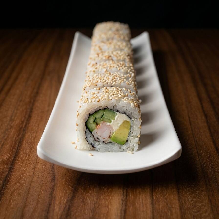 PF: Sésamo Blanco. PD: Pepino, Aguacate, Queso Crema, Alga, Surimi
